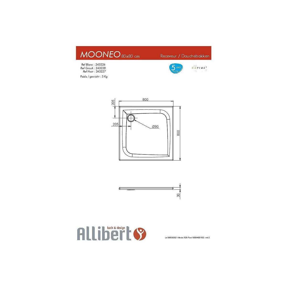 Receveur en Bioplax®, matériau exclusif Allibert. C'est une combinaison d'acrylique et d'ABS. Il présente l'avantage d'être naturellement antidérapant, et très résistant aux chocs et aux flexions. Il est renforcé avec de l'ABS, ce qui permet de ne pas utiliser de fibre de verre, comme on le voit généralement sous les bacs de douche. Ainsi, ce receveur est plus respectueux de l'environnement et se pose plus facilement sans risque de coupure avec la fibre de verre. Le receveur de douche Mooneo est à la fois élégant et durable, conçu pour vous accompagner pendant de nombreuses années. Caractéristiques du receveur de douche MOONEO : Matériaux respectueux de l'environnement : Bioplax Vidage angle Absence de fibre de verre Renfort ABS Type d’installation : A encastrer, à poser ou à surélever Receveur extra-plat Texture effet pierre pour un style naturel et un toucher agréable Surface antidérapante Garantie : 5 ans Fabriqué en France Coloris disponibles : Blanc, Gris anthracite et Noir Dimensions et poids du receveur de douche Mooneo : 80 x 80 x 3 cm - 5 kg 90 x 90 x 3 cm - 6,5 kg