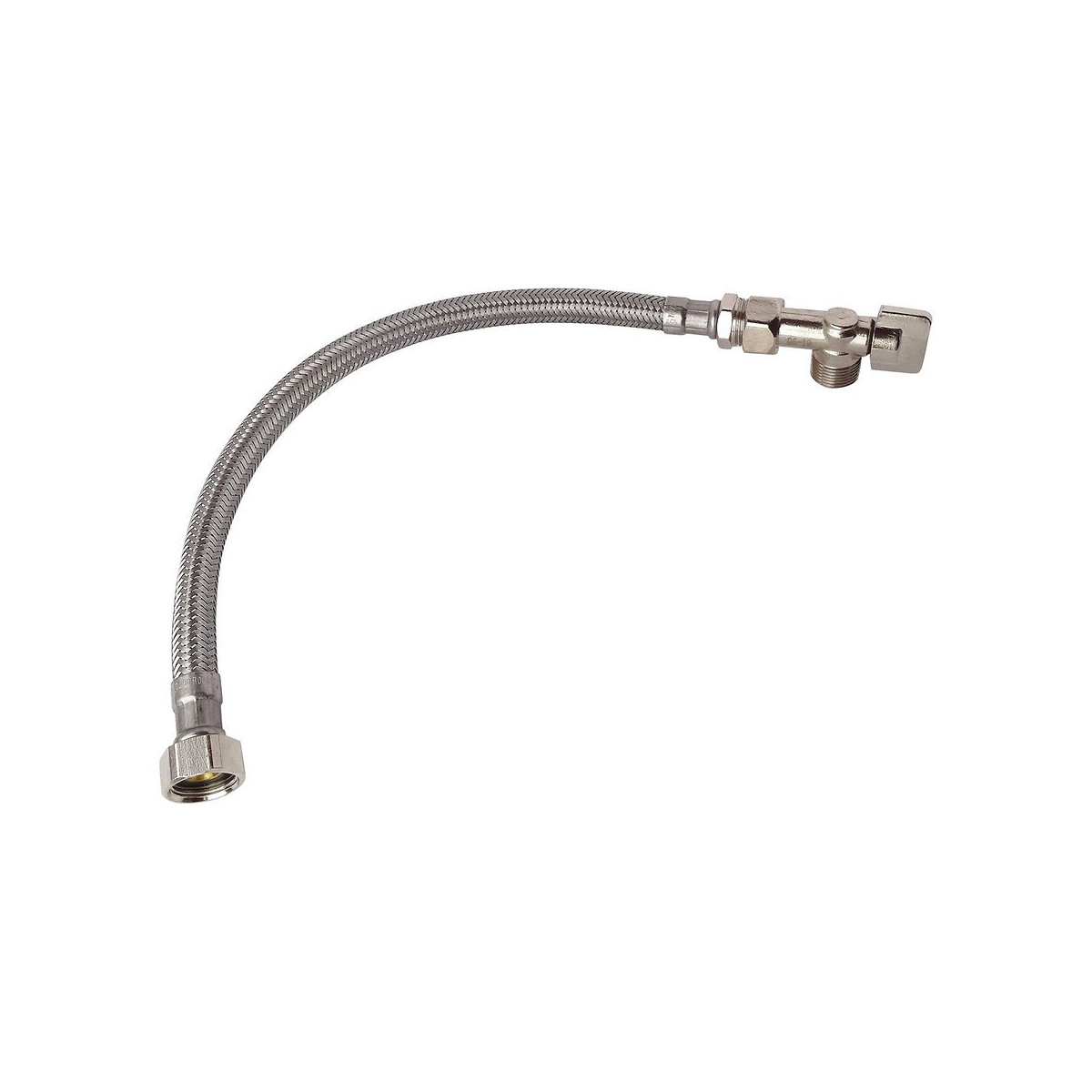 Kit de raccordement WC complet avec un robinet de WC équerre 1/4 de tour nickelé 12/17 (3/8''), un flexible M12/17 (3/8'') -F12/17 (3/8''), 2 joints. Installation facile et rapide.