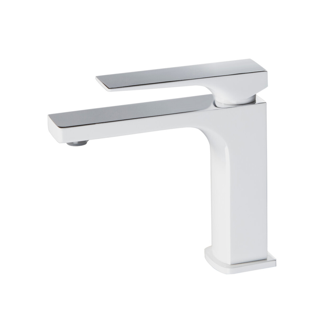 Mitigeur lavabo blanc et chrome hauteur 152mm Corps carré 35x35mm avec base 45x45mm Cartouche 25mm à limiteur de débit Aérateur anti-calcaire et économie d'eau Alimentation lyres tressées inox 35cm Vidage à tirette Kit de fixationSpécifications techniques