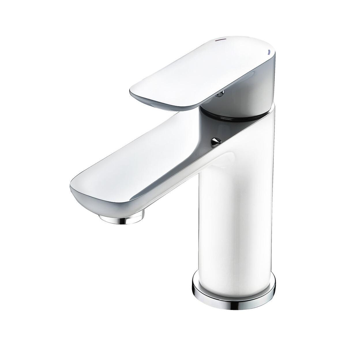 Mécanisme : cartouche céramique diamètre 35 mm Economie d’eau : aérateur réducteur de débit Poignée : métal chromé sur le dessus et blanche brillante sur le dessous Corps : laiton Bec : fixe Embase : diamètre 50 mm Vidage :tirette + bonde plastique Flexibles de raccordement : inox F 3/8 (12x17) Longueur 35 cm.Spécifications techniques