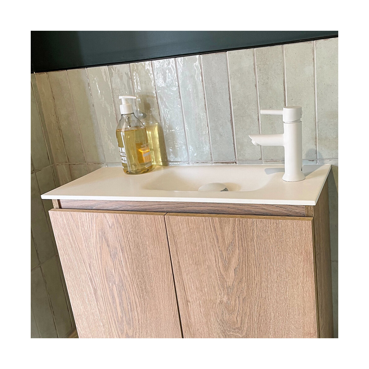 Le lave-main design pour votre salle de bain ! Le Luisa et sa couleur blanche apporte un coté minimaliste à votre pièce d'eau, de plus il est compatible eau chaude et froide ! DESIGN: - Robinet lave-main lavabo blanc. - Bec bas. - Finition blanc. - Corps rond. QUALITE: - Poignée en metal finition blanc. - Cartouche à disques céramique 25mm - Eau chaude et froide. - Kit de fixation inclus. - Alimentation lyres tressées inox 37cm. - Vidage à tirette avec bonde et clapet inox. NORMES: - Certification ACS : Accréditation de Conformité Sanitaire. GARANTIE: - Corps garanti 5 ans. - Pièces d'usure (poignée, cartouche, flexibles...) garanties 1 an. Dimensions - Hauteur totale : 14,5 cm - Hauteur sous bec : 7,3 cm - Largeur entre la sortie d'eau et l'axe du corps du robinet : 7,7 cm - Diamètre embase : 46,00 mm. Vérifiez que la longueur du bec est compatible avec votre évier (voir dessin technique) Conseil d'utilisation et d'installation - Avant de procéder au montage, nous vous conseillons de purger soigneusement les tuyauteries d'eau chaude et d'eau froide pour éviter que les saletés et résidus puissent compromettre le bon fonctionnement de la robinetterie. - Après avoir fermé l'alimentation d'eau principale, démonter l'ancienne robinetterie. - Nettoyer soigneusement le filetage des tubes d'alimentation d'eau principale. - Installer le mitigeur de cuisine dans un trou de 35 mm dans un évier ou plan de travail. Conseils d'entretien Pour garder votre robinet le plus longtemps possible, l’idéal est de le nettoyer tous les jours avec un chiffon humide non abrasif ou une microfibre, terminer en essuyant avec une microfibre ou un chiffon sec. Ne jamais utiliser de solvants, d'éponges métalliques, d’eau de javel, d'acides, de détergents puissants, de produits nettoyants chimiques agressifs ou de solutions de nettoyage à base de solvants sur le produit.Spécifications techniques