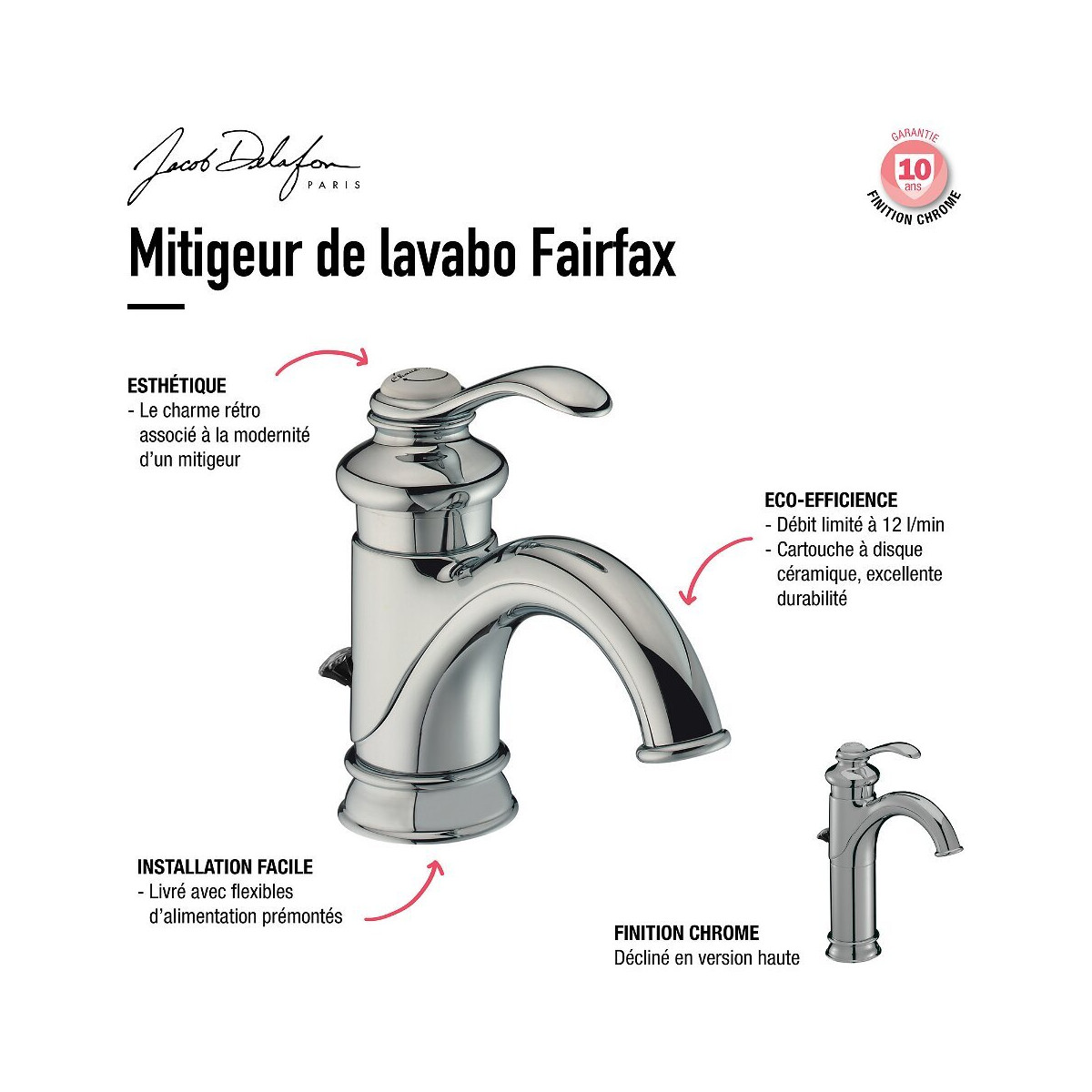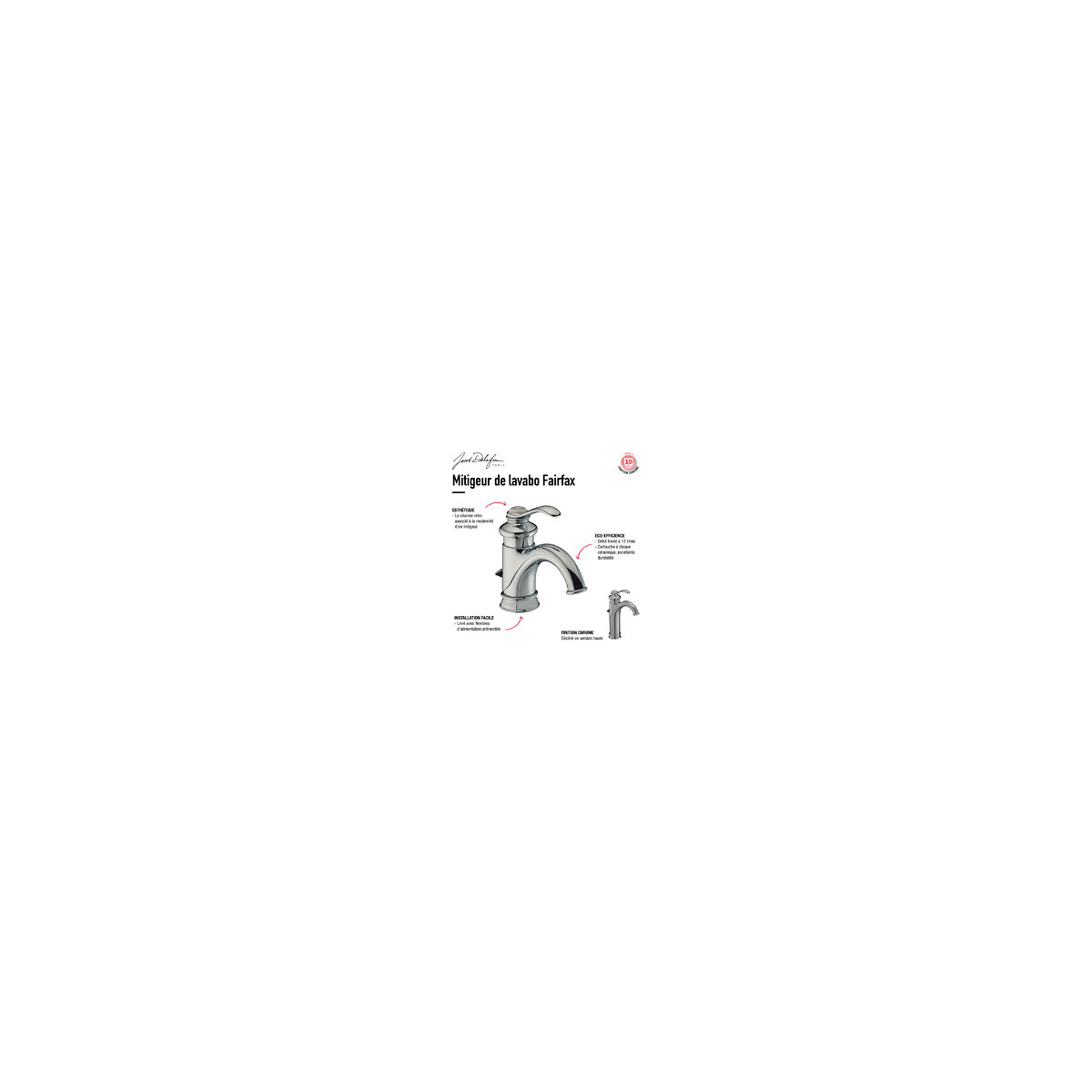 Points forts Le charme rétro associé à la modernité d un mitigeur Excellent rapport qualité/prix Design unique et travaillé Garantit un contrôle précis de la température Minimise les fluctuations de pression Caractéristiques techniques Installation monotrou Finition : chrome Bague-limiteur de température Filtre anti-calcaire intégré Cartouche à disques en céramique Produit vendu avec flexibles d alimentation Tirette à l arrière du robinet pour vider le lavabo Hauteur du robinet : 256 mm Profondeur du robinet : 147 mm Bonde de vidage en métal Poids : 2,60 Kg Garantie : 5 ans Référence : E72091-CP