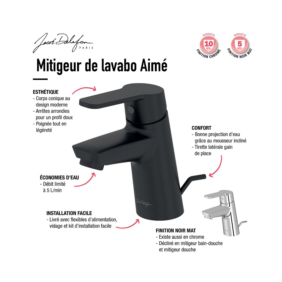 Points forts Design moderne et doux : arrêtes arrondies, poignée en toute légèrete Tirette latérale : adaptation aux petits espaces Débit d eau limité : économies Aérateur anti-calcaire : réduction de la fixation du calcaire Cartouche à disques céramique : durabilité et gestion de la température Installation du produit facile Garantie du mécanisme : 5 ans Garantie de la finition : 10 ans Caractéristiques techniques Mousseur incliné : bonne projection de l eau Mécanisme : cartouche à disques céramique Débit limité : 5l/min Livré avec flexibles d alimentation Kit d installation : un joint centreur, une tige filetée, un étrier antichute et un écrou Hauteur sous bec : 8 cm La longueur : 14,7 cm La largeur : 4,9 cm La hauteur : 15,1 cm Disponible en deux coloris Chrome - Ref : E29869-CP Black - Ref : E29869-BL
