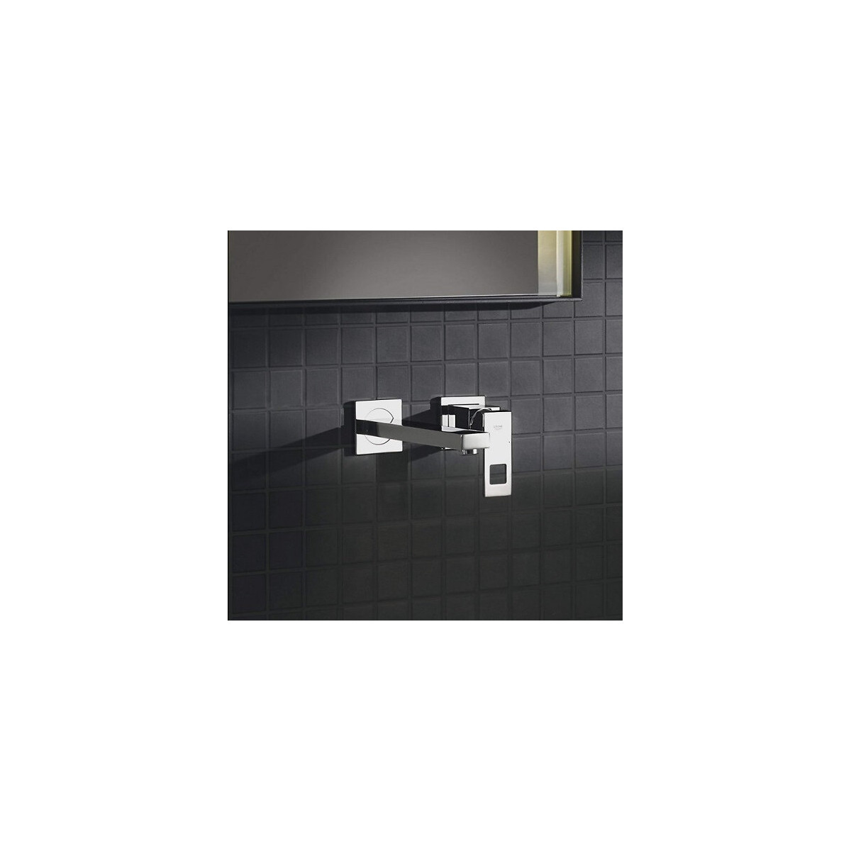 Ce robinet mural Grohe comprend Robinet lavabo mural Grohe Eurocube Taille M + Corps encastré pour robinet mural salle de bain Points forts Design moderne et contemporain Technologies innovantes Matériaux haut de gamme Technologie AquaGuide : extrémité de bec réglable pour ajuster l écoulement d eau Finition Grohe StarLight : chrome ultra brillant résistant aux rayures et au calcaire Facile à nettoyer grâce au revêtement Fonction Ecojoy : économie d eau pour une consommation réduite jusqu à 50 % Confort optimal grâce à un mousseur ajustable Garantie : 5 ans Caractéristiques Type d installation : robinet mural à encastrer Plaque de finition en métal Levier de commande métallique Technologie GROHE AquaGuide : possibilité d ajuster l angle du mousseur selon votre envie Longueur bec du robinet mural Grohe : 23.1 cm Entraxe (longueur entre le levier de commande et le bec du robinet Grohe) : 11 cm Référence : 23447000 Caractéristiques du corps encastré Type d installation : corps à encastrer 2 trous Cartouche céramique 35 mm de très haute qualité pour un mécanisme robuste et très précis Profondeur d encastrement 45 à 75 mm Corps en laiton Gabarit d encastrement Référence : 23200000