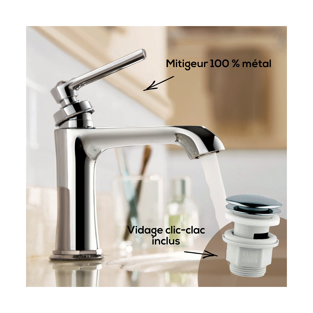 Caractéristiques du mitigeur de lavabo Lady s 100 Ambiance rétro Fiable, esthétique et confort maximum Hauteur totale : 180 mm Hauteur sous bec : 100 mm Saillie du bec : 130 mm Ø de perçage : 35 mm Livré avec vidage clic-clac Mitigeur garanti 5 ans 2 modèles disponibles 909CR100 - Finition chrome 909ORB100 - Finition Auburn