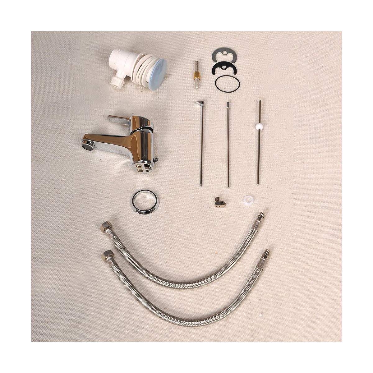 Robinet mitigeur DUBLIN chromé Mitigeur en laiton chromé brillant Clapet de vidange à levier, bonde et flexibles de 35 cm fournis Nettoyage et installation facileSpécifications techniques