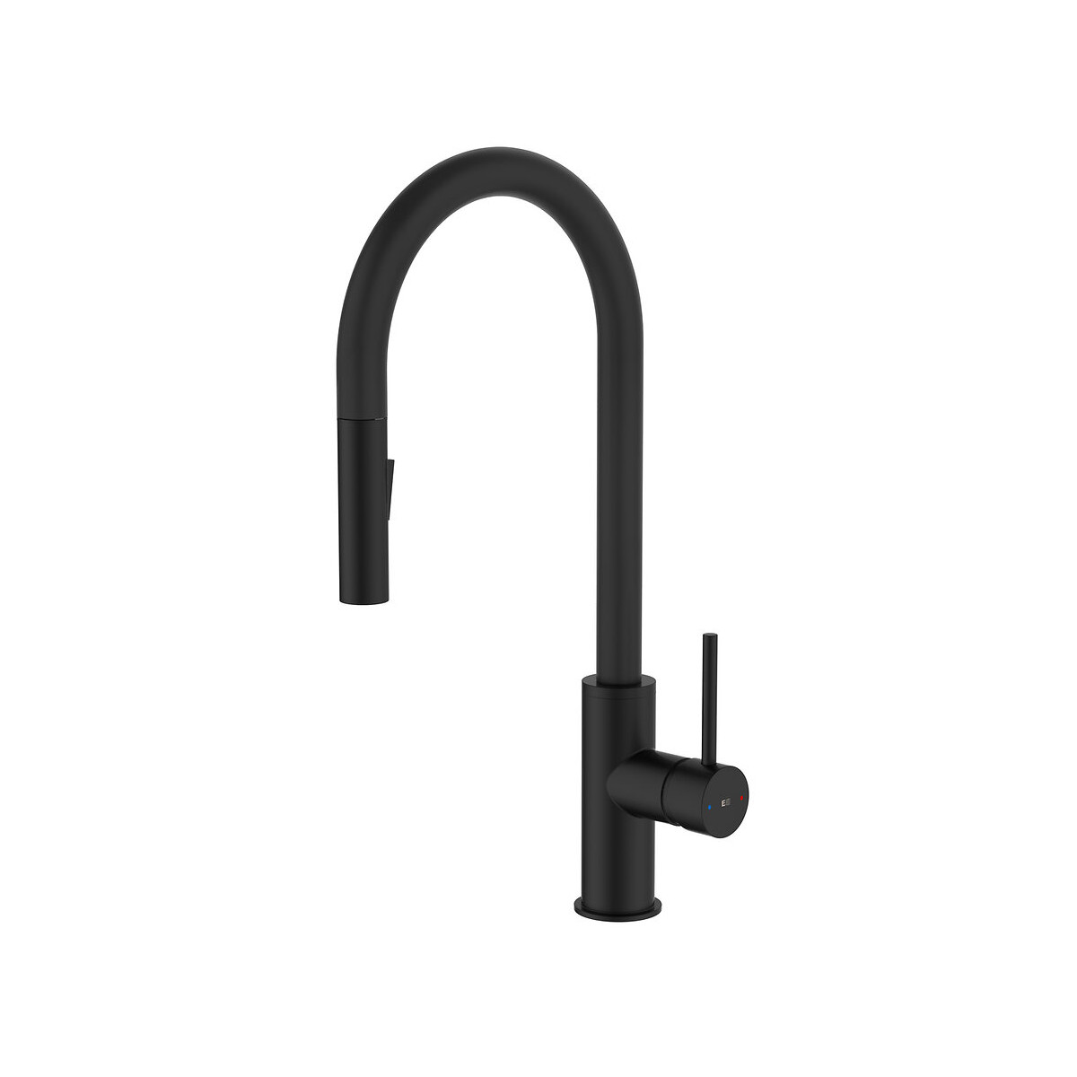 Mitigeur évier à douchette noir mat Hauteur 470 mm Corps diamètre 55 mm à la base Cartouche à disques-céramique de 35 mm Douchette 2 jets extractible Flexible intérieur 1m50 avec contre-poidsAlimentation lyres tressées inox 35cm Kit de fixationSpécifications techniques