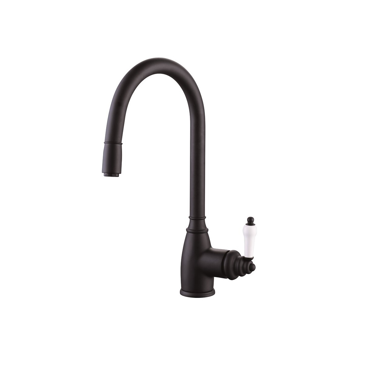 Mitigeur évier noir à douchette hauteur 405mm Corps diamètre 61,5mm à la base Cartouche à disques céramique de 35mm Bec mobile avec douchette extractible Flexible intérieur 150cm avec contre-poids Poignée avec embout blanc en céramiqueAlimentation lyres tressées inox 40cm Kit de fixationSpécifications techniques