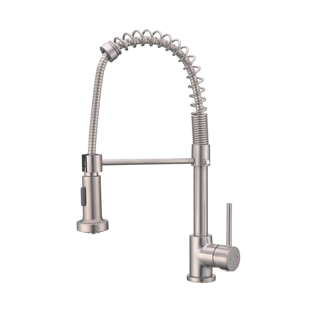 Mitigeur évier à douchette façon inox hauteur 427mm Corps diamètre 40mm avec base 51mm Cartouche à disques céramique de 35mm Ressort serré en métal avec douchette 2 jets Barre stabilisatrice de maintien Alimentation lyres tressées inox 35cmFIXATION FACILESpécifications techniques