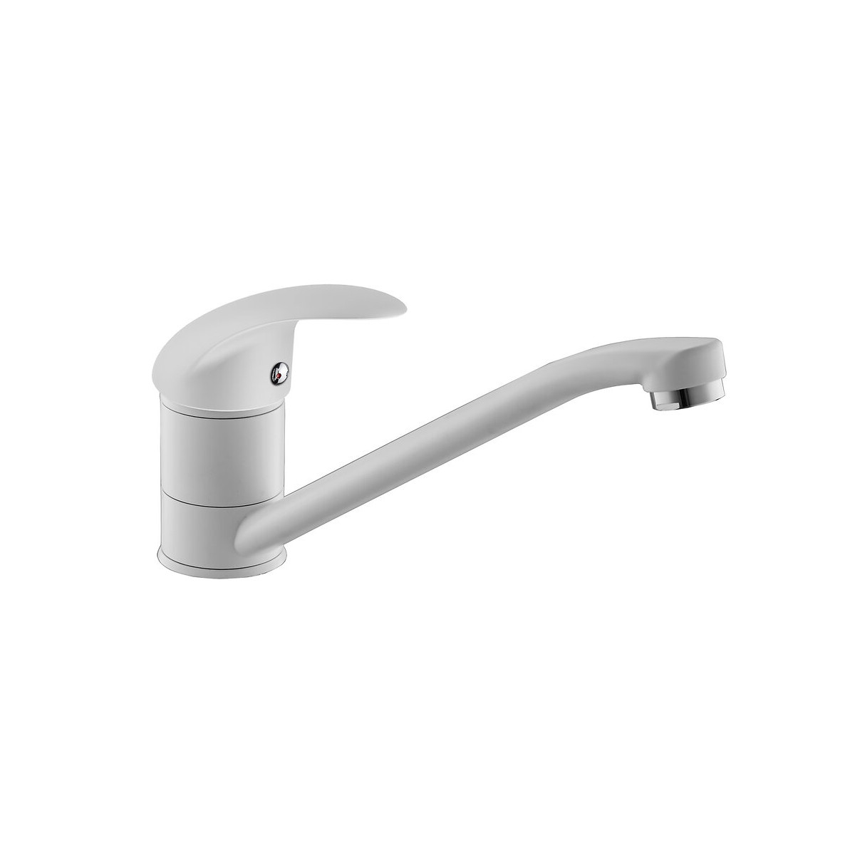 Mitigeur évier blanc mat hauteur 152mm Corps diamètre 48mm avec base 50mm Cartouche à disques céramique de 40mm à limiteur de débit Bec profilé mobile Alimentation lyres tressées inox 35cm Kit de fixationSpécifications techniques