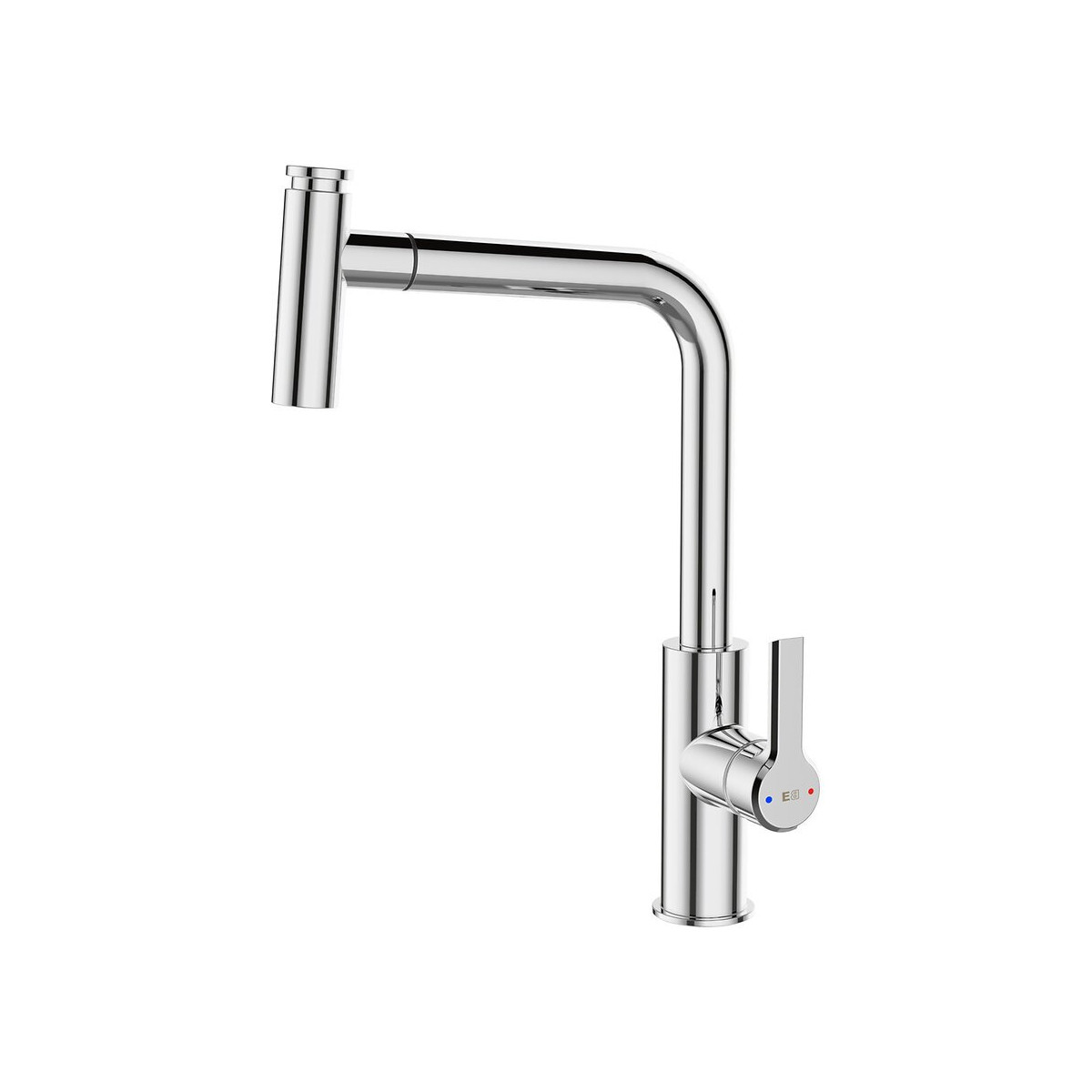 Mitigeur évier à douchette hauteur 407mm Corps diamètre 46mm avec base 55mm Cartouche à disques céramique 35mm Douchette extractible 2 jets Flexible intérieur 150cm avec contre-poids Alimentation lyres tressées inox 40cmKit de fixation facileSpécifications techniques