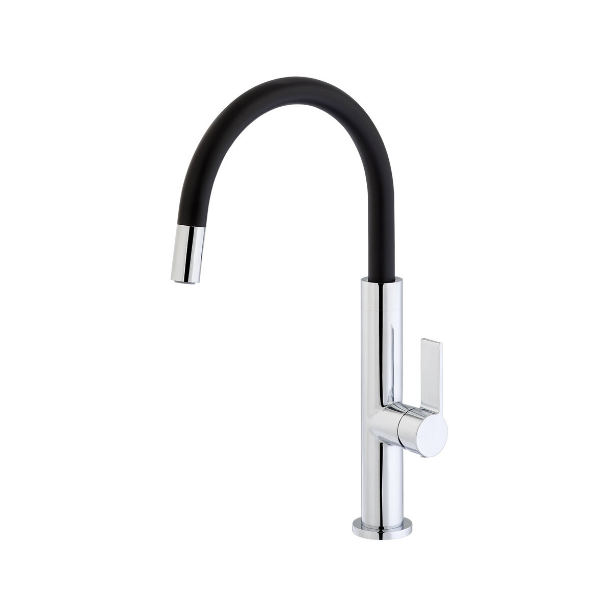 Mitigeur évier chromé noir hauteur 420mm Corps diamètre 38mm avec base 54mm Cartouche 25mm à limiteur de débit Aérateur anti-calcaire Alimentation lyres tressées inox 35cm Kit de fixationSpécifications techniques