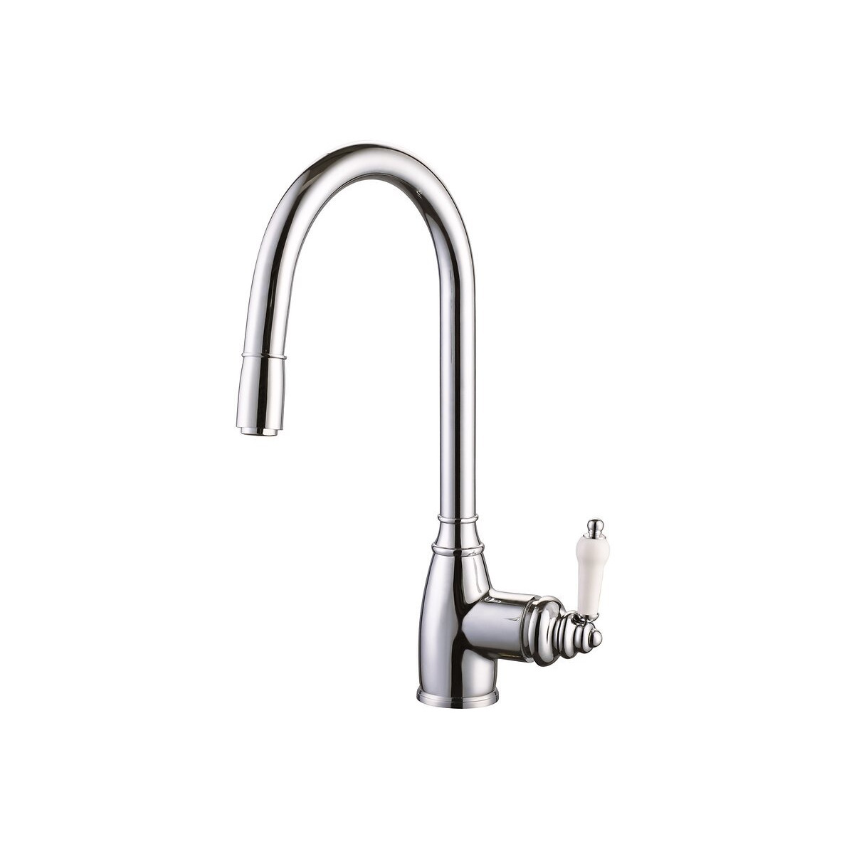 Mitigeur évier chromé à douchette hauteur 405mm Corps diamètre 61,5mm à la base Cartouche à disques céramique de 35mm Bec mobile avec douchette extractible Flexible intérieur 150cm avec contre-poids Poignée avec embout blanc en céramiqueAlimentation lyres tressées inox 40cm Kit de fixationSpécifications techniques