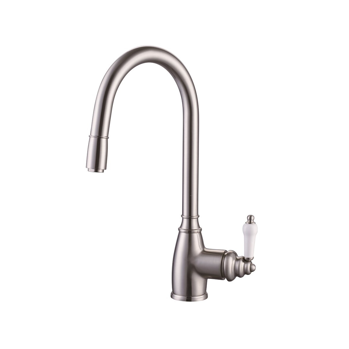 Mitigeur évier façon inox à douchette hauteur 405mm Corps diamètre 61,5mm à la base Cartouche à disques céramique de 35mm Bec mobile avec douchette extractible Flexible intérieur 150cm avec contre-poids Poignée avec embout blanc en céramiqueAlimentation lyres tressées inox 40cm Kit de fixationSpécifications techniques
