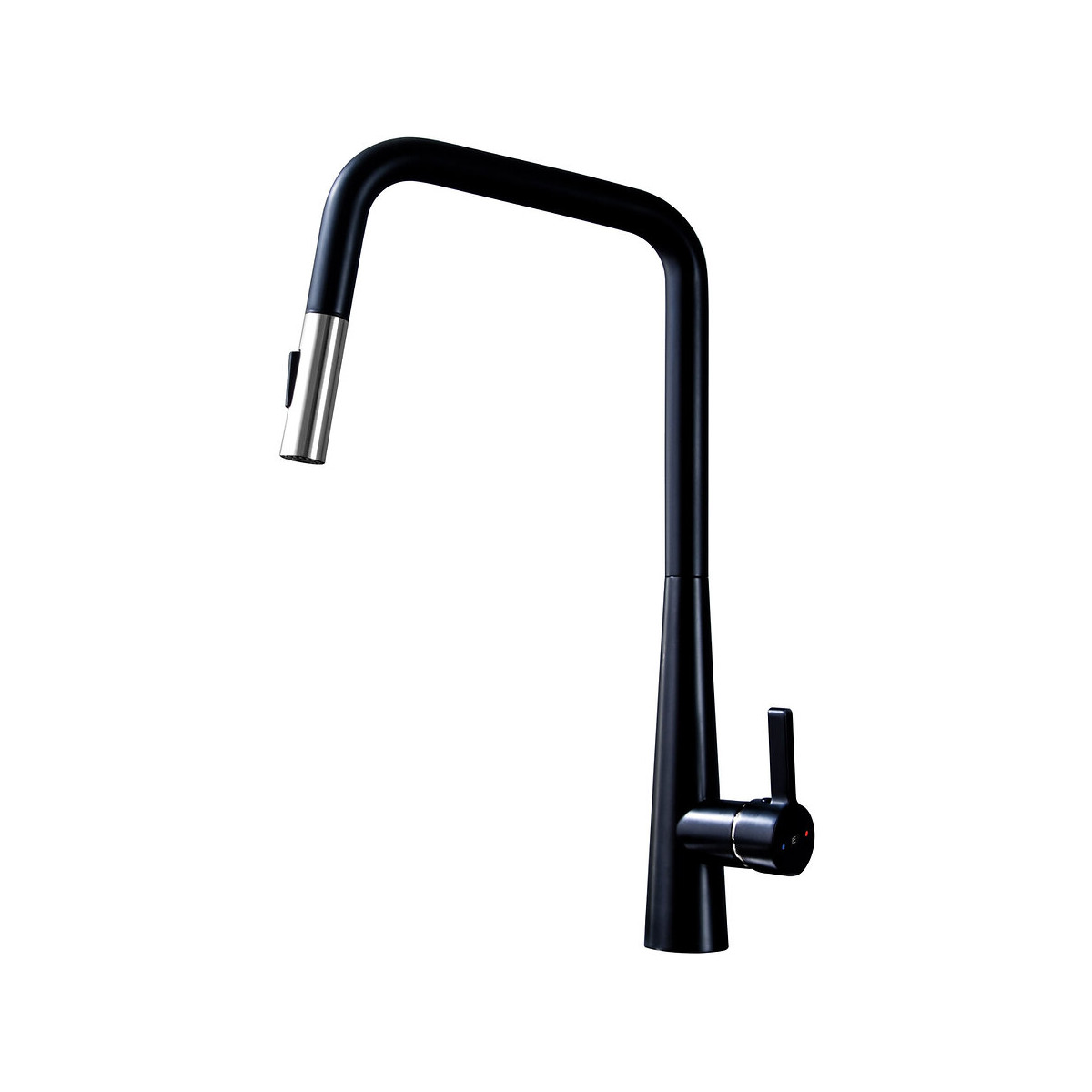 Mitigeur évier à douchette noir hauteur 508mm Base diamètre 54mm Cartouche 25mm Douchette 2 jets chromée Alimentation lyres tressées inox 50cm Kit de fixation facileSpécifications techniques
