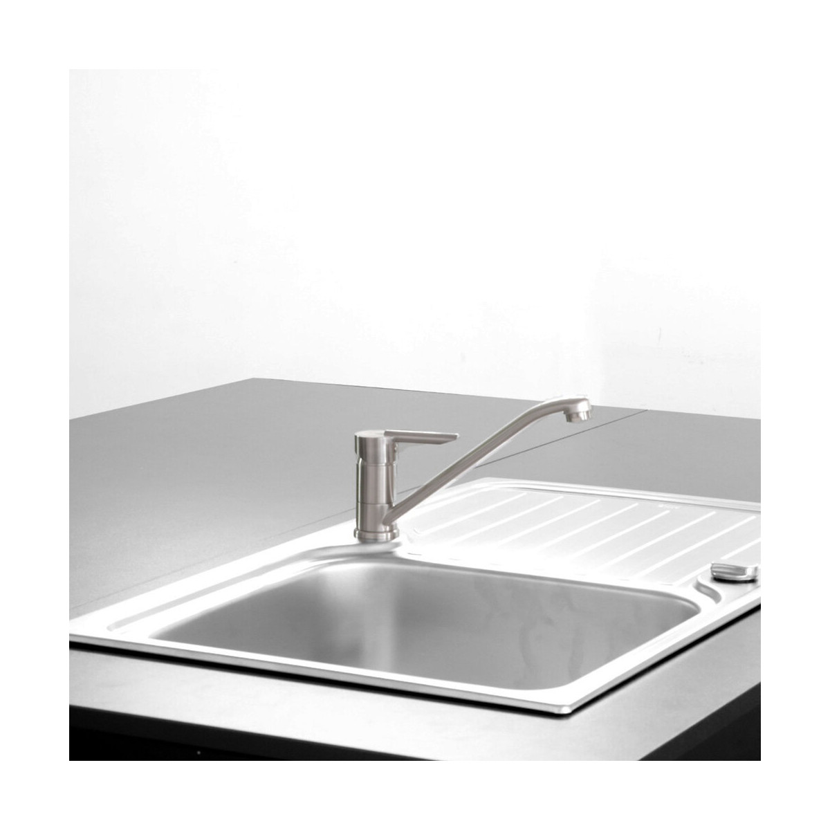 Le Tango Plus est un mitigeur évier façon inox qui habillera parfaitement votre cuisine grâce à sa couleur chromé. Equipé d'un kit de fixation il vous sera de plus facile d'installation. Le Tango est garantie 10 ans. DESIGN: - Mitigeur lavabo. - Bec bas. - Finition façon inox. - Corps rond. - Pour plan vasque. QUALITE: - Corps en laiton finition façon inox. - Poignée en métal. - Cartouche céramique 35 mm de diamètre. - Aérateur anticalcaire : limite la production de calcaire. NORMES: - Certification ACS : Accréditation de Conformité Sanitaire. - Certification NF : Normes Françaises GARANTIE: - Corps garanti 10 ans. - Pièces d'usure (poignée, cartouche, flexibles...) garanties 1 an. Dimensions - Hauteur totale : 16,70 cm - Hauteur sous bec : 14,00 cm - Largeur entre la sortie d'eau et l'axe du corps du robinet : 22,70 cm - Diamètre embase : 51,00 mm. Vérifiez que la longueur du bec est compatible avec votre évier (voir dessin technique) Conseil d'utilisation et d'installation - Avant de procéder au montage, nous vous conseillons de purger soigneusement les tuyauteries d'eau chaude et d'eau froide pour éviter que les saletés et résidus puissent compromettre le bon fonctionnement de la robinetterie. - Après avoir fermé l'alimentation d'eau principale, démonter l'ancienne robinetterie. - Nettoyer soigneusement le filetage des tubes d'alimentation d'eau principale. - Installer le mitigeur de cuisine dans un trou de 35 mm dans un évier ou plan de travail. Conseils d'entretien Pour garder votre robinet le plus longtemps possible, l’idéal est de le nettoyer tous les jours avec un chiffon humide non abrasif ou une microfibre, terminer en essuyant avec une microfibre ou un chiffon sec. Ne jamais utiliser de solvants, d'éponges métalliques, d’eau de javel, d'acides, de détergents puissants, de produits nettoyants chimiques agressifs ou de solutions de nettoyage à base de solvants sur le produit.Spécifications techniques