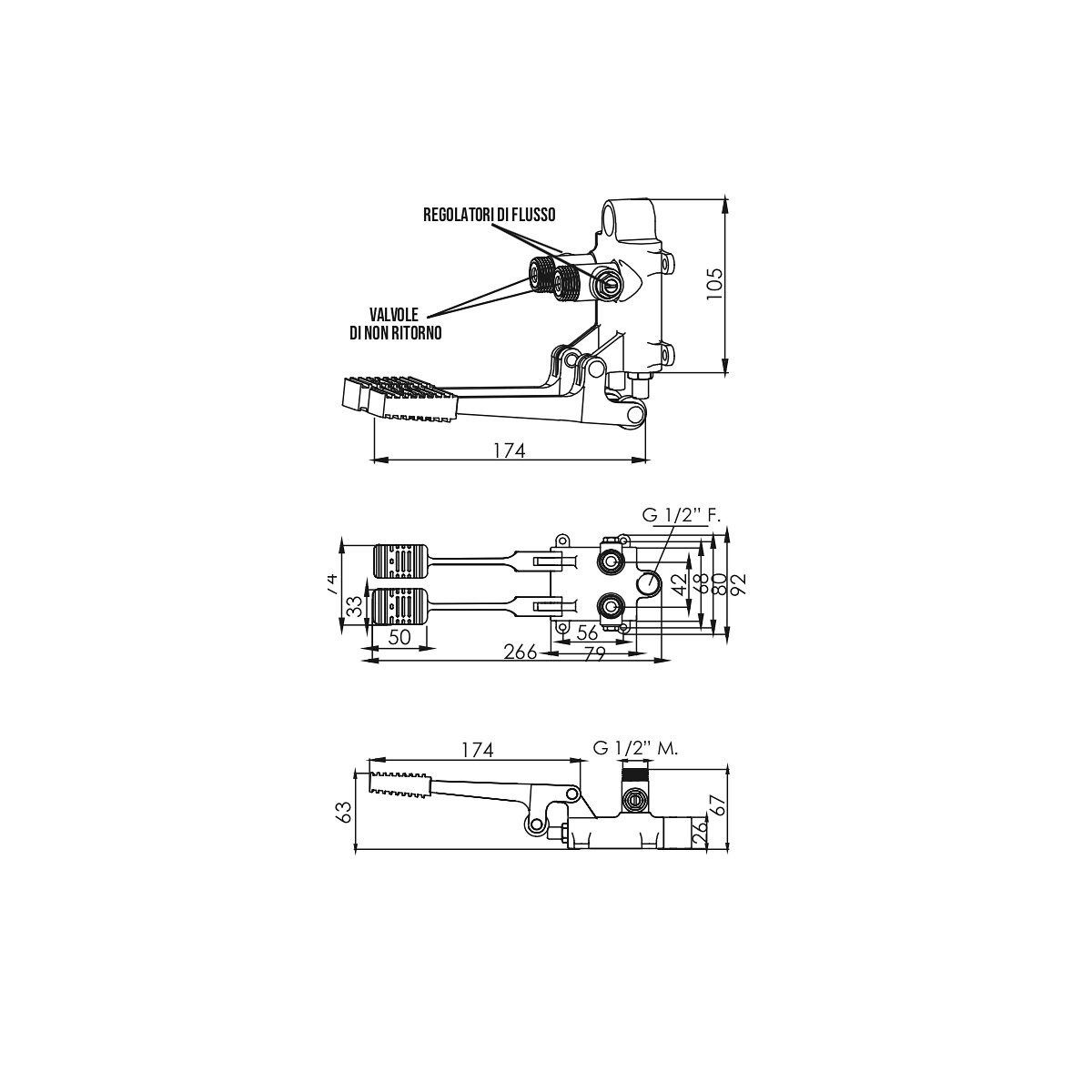 MISCELATORE A PEDALE, DUE PEDALI CALDA FREDDA DOPPIA INSTALLAZIONE CARATTERISTICHETipo di installazione: pavimento/parete Corpo: ottone conforme DM 174 Pedale: metallo con gomma antiscivolo Finitura: cromoIngresso acqua fredda: 1/2" maschio Ingresso acqua calda: 1/2" maschio Uscita erogazione: 1/2" femmina Pressione di esercizio: max. 6 BAR Temperatura di esercizio: max. 70°C DOTAZIONE DI SERIERegolatori di flussoValvole di non ritornoGuarnizioni con filtro inox Raccordo M.M. 1/2" cromoViti di fissaggio in acciaio Ø 10 mmSpécifications techniques