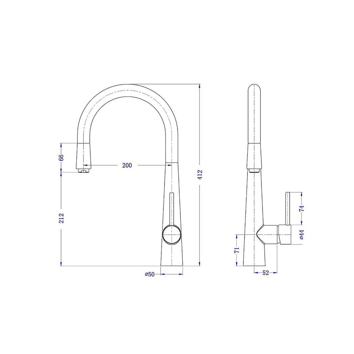 Voici le mitigeur chromé Fame, doté d'une douchette extractible et d'un limiteur de débit. Coté design on retrouve une base évasée ainsi qu'une poignée latérale très design. DESIGN: - Mitigeur évier cuisine. - Bec mobile avec douchette extractible. - Finition chromé. - Corps rond. QUALITE: - Corps en laiton chromé. - Poignée en métal. - Cartouche céramique (limiteur de débit) 35 mm de diamètre. - Flexible intérieur 150 cm avec contre-poids. - Kit de fixation inclus - Lyres tréssées inox d'alimentation à l'eau 35cm fournis. NORMES: - Certification ACS : Accréditation de Conformité Sanitaire. GARANTIE: - Corps garanti 5 ans. - Pièces d'usure (poignée, cartouche, flexibles...) garanties 1 an. Dimensions - Hauteur totale : 41,20 cm - Hauteur sous bec : 21,20 cm - Largeur entre la sortie d'eau et l'axe du corps du robinet : 20 cm - Diamètre embase : 5 mm. Vérifiez que la longueur du bec est compatible avec votre évier (voir dessin technique) Conseil d'utilisation et d'installation - Avant de procéder au montage, nous vous conseillons de purger soigneusement les tuyauteries d'eau chaude et d'eau froide pour éviter que les saletés et résidus puissent compromettre le bon fonctionnement de la robinetterie. - Après avoir fermé l'alimentation d'eau principale, démonter l'ancienne robinetterie. - Nettoyer soigneusement le filetage des tubes d'alimentation d'eau principale. - Installer le mitigeur de cuisine dans un trou de 35 mm dans un évier ou plan de travail. Conseils d'entretien Pour garder votre robinet le plus longtemps possible, l’idéal est de le nettoyer tous les jours avec un chiffon humide non abrasif ou une microfibre, terminer en essuyant avec une microfibre ou un chiffon sec. Ne jamais utiliser de solvants, d'éponges métalliques, d’eau de javel, d'acides, de détergents puissants, de produits nettoyants chimiques agressifs ou de solutions de nettoyage à base de solvants sur le produit.Spécifications techniques