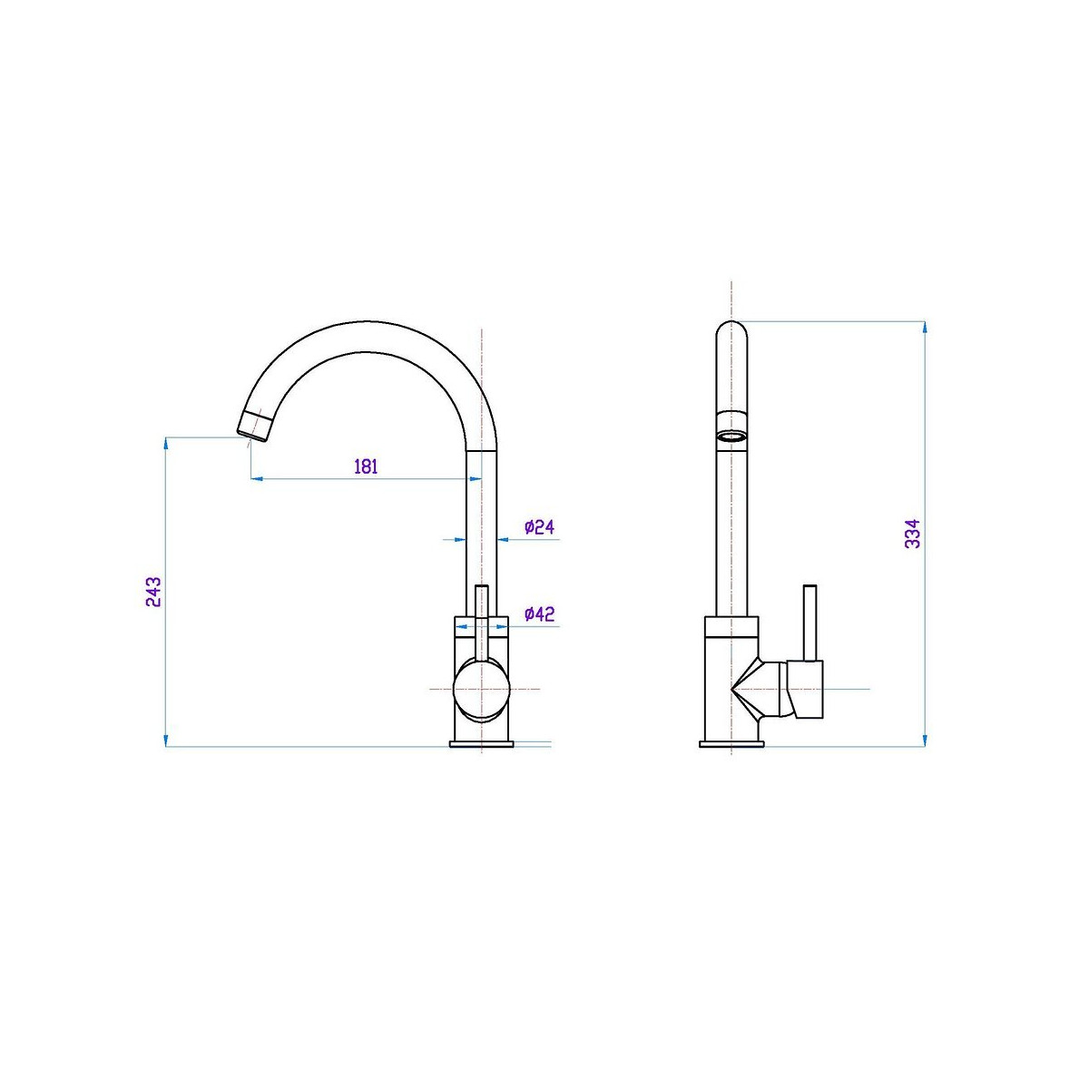 Un Classique dans votre cuisine avec le mitigeur pour évier Delice. Couleur noir mat moderne et col de cygne pivotant pour le coté design ! DESIGN: - Mitigeur évier cuisine. - Bec mobile. - Finition noir et chromé. - Corps rond. QUALITE: - Corps en laiton blanc finition chromé. - Poignée en métal. - Cartouche à disques céramique 35 mm - Kit de fixation inclus. - Lyres tréssées inox d'alimentation à l'eau 40cm inclus NORMES: - Certification ACS : Accréditation de Conformité Sanitaire. GARANTIE: - Corps garanti 5 ans. - Pièces d'usure (poignée, cartouche, flexibles...) garanties 1 an. Dimensions - Hauteur totale : 33.4 cm - Hauteur sous bec : 24.3 cm - Largeur entre la sortie d'eau et l'axe du corps du robinet : 18,1 cm - Diamètre embase : 50mm. Vérifiez que la longueur du bec est compatible avec votre évier (voir dessin technique) Conseil d'utilisation et d'installation - Avant de procéder au montage, nous vous conseillons de purger soigneusement les tuyauteries d'eau chaude et d'eau froide pour éviter que les saletés et résidus puissent compromettre le bon fonctionnement de la robinetterie. - Après avoir fermé l'alimentation d'eau principale, démonter l'ancienne robinetterie. - Nettoyer soigneusement le filetage des tubes d'alimentation d'eau principale. - Installer le mitigeur de cuisine dans un trou de 35 mm dans un évier ou plan de travail. Conseils d'entretien Pour garder votre robinet le plus longtemps possible, l’idéal est de le nettoyer tous les jours avec un chiffon humide non abrasif ou une microfibre, terminer en essuyant avec une microfibre ou un chiffon sec. Ne jamais utiliser de solvants, d'éponges métalliques, d’eau de javel, d'acides, de détergents puissants, de produits nettoyants chimiques agressifs ou de solutions de nettoyage à base de solvants sur le produit.Spécifications techniques