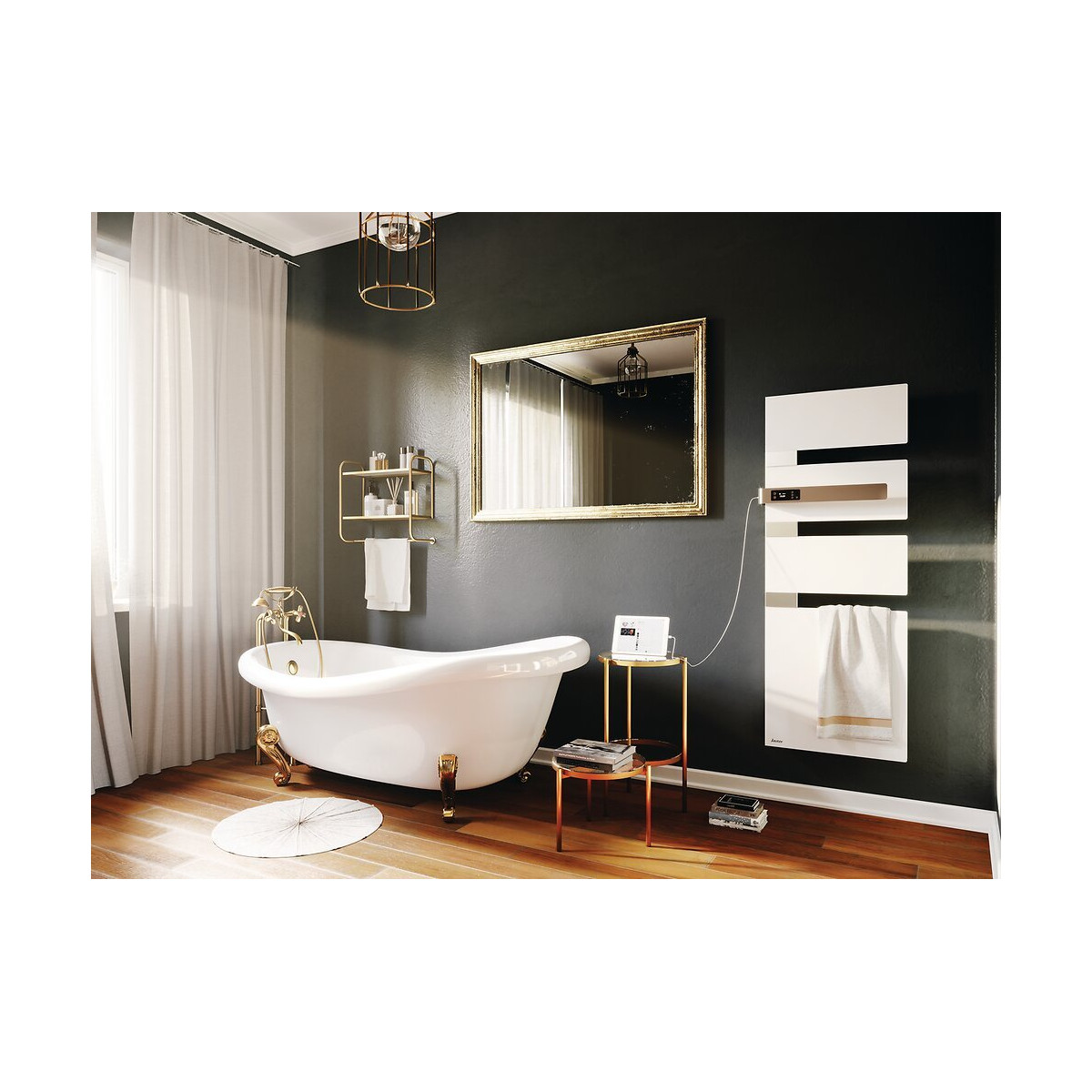 RADIATEUR Sèche-serviettes connecté Pilotage à distance via smartphone & tablette avec Cozytouch® (bridge non inclus dans l’emballage) LE SON HAUTE DEFINITION DANS LA SALLE DE BAINS Enceintes Cabasse® intégrées pour écouter votre musique dans votre salle de bains depuis n’importe quelles sources musicales Bluetooth® CHAUFFE LA SALLE DE BAINS, MÊME RECOUVERT DE SERVIETTES Technologie brevetée 3CS® : les seuls radiateurs sèche-serviettes qui chauffent la salle de bains, chauffent les serviettes et sèchent les serviettes simultanément, même recouverts de serviettes Serviettes chaudes et moelleuses S'ADAPTE AUX IMPRÉVUS Fonction boost (+ 3° en moins de 15 min) en accès direct ou pilotable à distance Programmation libre en accès direct ou pilotable à distance PRATIQUE Boîtier digital tactile, intégré et facile d’accès avec affichage de l’heure & météo Prise d’alimentation USB intégrée Une barre fixe pour suspendre encore plus de serviettes Asymétrique (mât à gauche ou à droite) pour un accès rapide & simplifié aux serviettes Fonction séchage du linge Ventilo/soufflerie discret & silencieux Installation simplifiée grâce au gabarit de pose inclus dans l'emballageSpécifications techniques