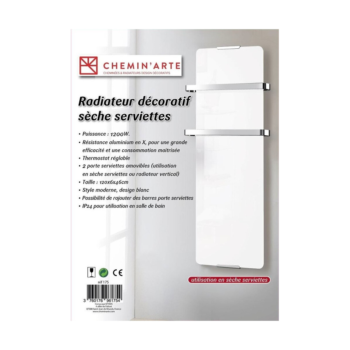 175 - Avec ce sèche-serviette décoratif blanc en verre trempé, oubliez les séchoirs électriques ternes ! Devenue un lieu privilégié des ambiances relaxantes et confortables, la salle de bain ou de douche peut désormais abandonner le blanc standard et classique. Ultra design, ce sèche-serviette blanc dispose d'une structure en acier inox et d'un revêtement frontal en verre trempé blanc (traité anti coupure) de 5 mm d'épaisseur effet miroir ! Fonctionnel, ce chauffage de salle de bain propose 2 barres porte serviette en acier inox. - Puissance : 1200 W Chauffage par convection et par rayonnement de la vitre Thermostat réglable 1200 w -- Résistance aluminium haute performance en X (grande efficacité et consommation maîtrisée) Structure en acier blanc, paroi frontale en verre trempé Sécurit 5mm avec déco Miroir Style moderne 2 barres porte-serviette amovibles coloris acier inox Pratique, les barres se fixent sur l'arrière de la paroi pour un effet visuel ultra-design, et permettent d'utiliser ce sèche-serviette comme un panneau rayonnant sans les barres. Sécurité : Radiateur classe IP24 (compatible salle d'eau et salle de bain) Permet de chauffer aisément une pièce de 15m² Se fixe au mur Dimensions (H x P x l) : 120 x 6 x 46 cm Poids : 15 kg Livré avec un manuel de montage et d'utilisation, 2 porte serviettes, kit d'installation murale
