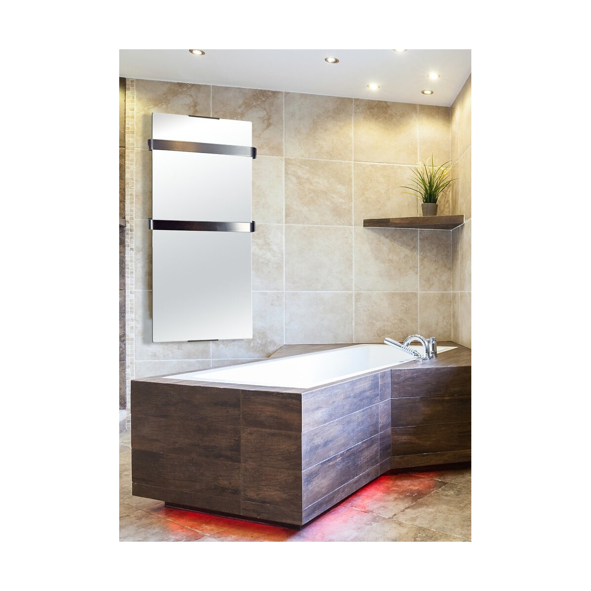 112 - Vous avez sûrement entendu parler de LA grande tendance déco : les miroirs. Déclinés sur de plus en plus de supports, de nos meubles en passant par nos radiateurs, les miroirs apportent un côté chic et sobre à la fois. Idéal pour décorer votre salle de bains avec modernité et élégance, le radiateur sèche serviette miroir vous offre un confort thermique de grande qualité. Sa puissance de 900 W en convection rayonnante vous permet de chauffer une pièce de 12 m². Équipé d'un thermostat ainsi que de deux modes de chauffage sélectionnables depuis le sèche serviette, vous maîtrisez votre consommation et l'ajustez selon vos besoins. - Puissance : 900 W en convection rayonnante (une partie de la chaleur est issue de la convection et l'autre du rayonnement de la vitre) 2 modes de chauffage 600 et 900 W sélectionnable depuis le radiateur Thermostat mécanique Le corps du sèche serviette est en acier blanc La façade est en verre trempé (anti coupure) de 5mm d'épaisseur IP24, utilisable en salle de bain Résistance aluminium haute performance en X. Cette résistance permet une grande efficacité et une consommation maitrisée Thermostat de réglage de la température Design moderne et épuré. Panneau de verre design Sable Possibilité de rajouter des barres portes serviettes (vendues séparément) Les barres portes serviettes peuvent s'enlever pour en faire un radiateur vertical Se fixe au mur à l'aide des accessoires livrés Chauffe une pièce d'environ 12 m² Aucun entretien, pas de fumée, pas d'odeur, pas de poussière Installation rapide et aisée (5 minutes environ) Livré avec un manuel de montage et d'utilisation, 1 porte serviette, kit d'installation murale Dimensions : 100 x 6 x 46 cm Finition : Miroir