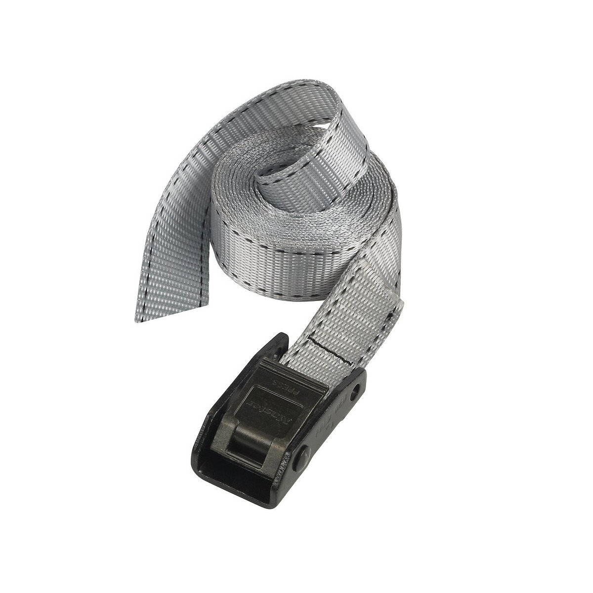 Set de 2 sangles bagagères. Coloris gris. Charge maximale : 150 kg. Dimensions : Largeur 25 mm x Longueur 2,5 m. Boucle à griffes renforcée avec 2 rangées de griffes pour une meilleure prise de la sangle.
