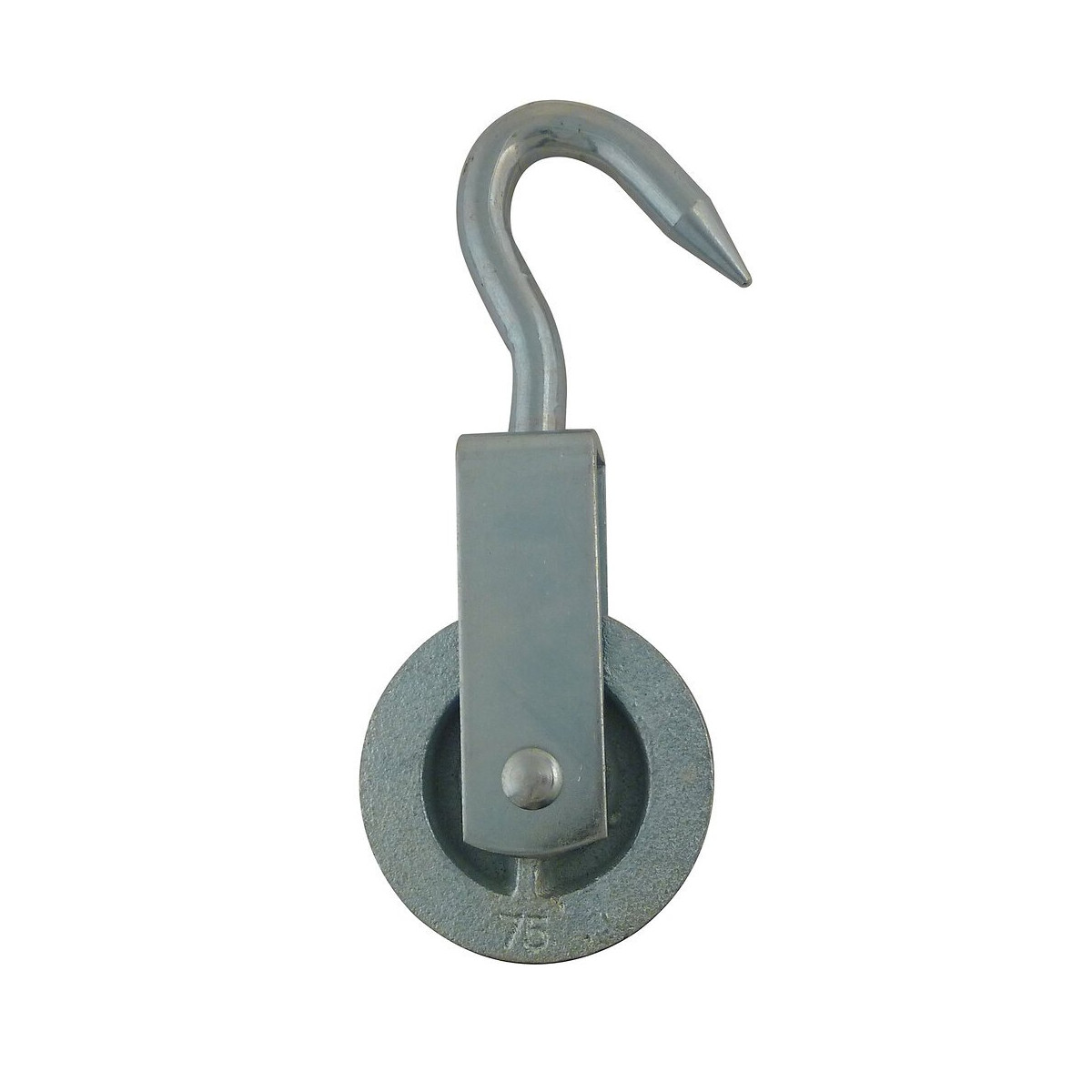 Poulie de hissage à crochet en acier galvanisé. Caractéristiques : Diamètre crochet : 12 mm Diamètre galet : 75 mm Épaisseur galet : 15 mm Galet en fonte. Charge maximale : 400 kg Charge de rupture : 1200 Kg
