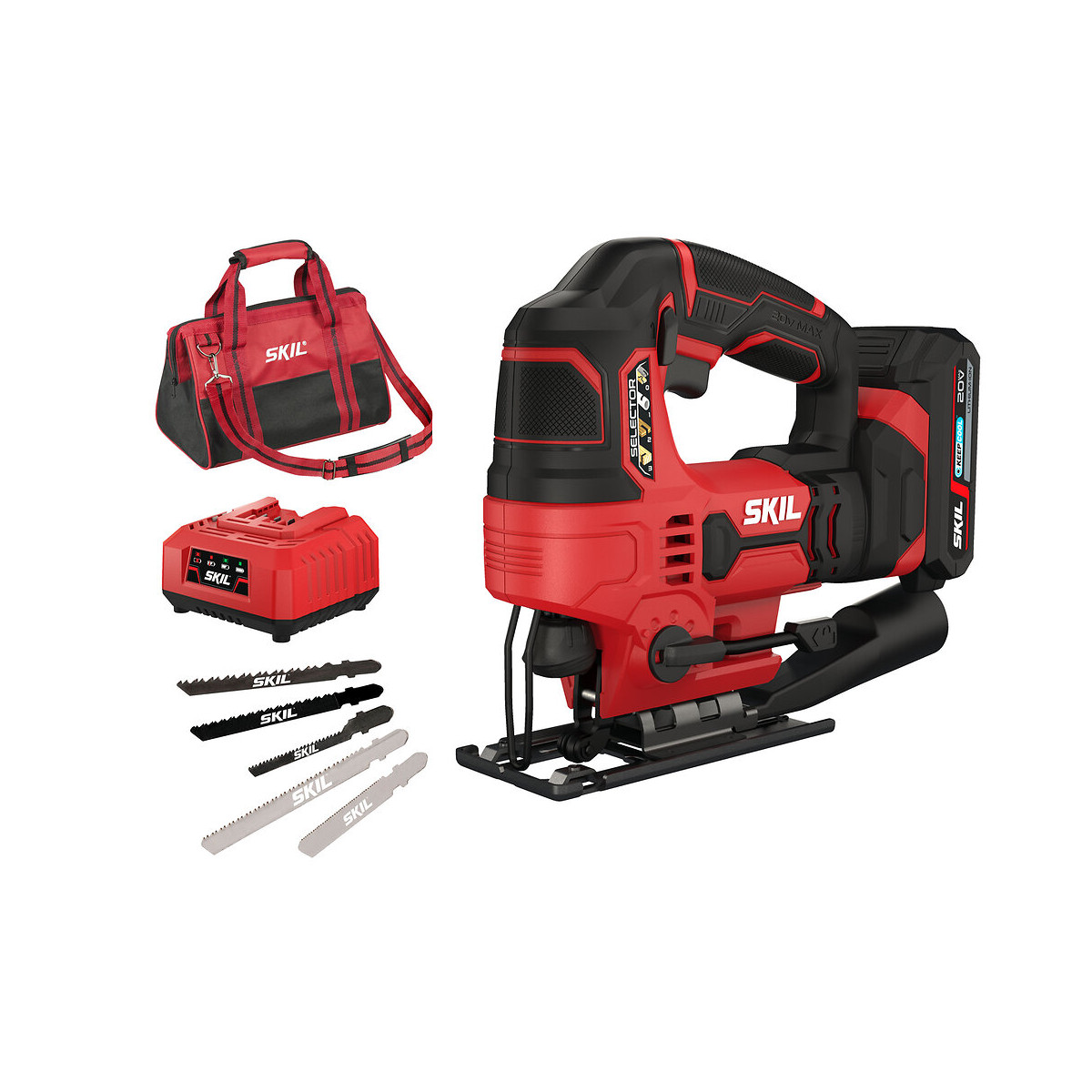 Puissante scie sauteuse sans fil avec sélecteur de matériau La scie sauteuse sans fil « 20V Max » (18 V) SKIL 3420 est spécialement conçue pour la réalisation de coupes droites et courbes de précision. Bonne visibilité du travail effectué grâce à l’éclairage LED. Le sélecteur de matériau à quatre positions assure une adaptation parfaite aux besoins de chaque application. Le variateur de vitesse garantit de très bons résultats dans une grande variété de matériaux. Grâce au système de fixation « Clic », les lames peuvent être changées facilement, sans aucun outil. La scie dispose aussi d’un souffleur de poussière assurant une vue dégagée sur la pièce et d’une semelle inclinable sans clé permettant de réaliser des coupes biaises jusqu’à 45°. Pour que l’environnement de travail reste propre, la scie dispose aussi d’un adaptateur pour aspirateur compatible avec la plupart des aspirateurs standard. De plus, la forme ergonomique avec poignée bi-matière assure une prise en main parfaite. La scie SKIL 3420 DA est fournie dans un sac de transport avec une batterie 2,5 Ah « 20V Max » (18 V) « Keep Cool », un chargeur rapide, trois lames pour bois, deux lames pour métal et un adaptateur pour aspirateur. Tension : 20 « V Max » Capacité batterie : 1 x 2,5 Ah Keep Cool Vitesse de la lame : 0-2800 courses/min Réglages du mouvement pendulaire : 4 Longueur de course : 23 mm Capacité de sciage bois/alu/métal : 65/8/6 mm Raccord pour aspirateur Changement de lame rapide et aisé avec le système « Clic »Spécifications techniques