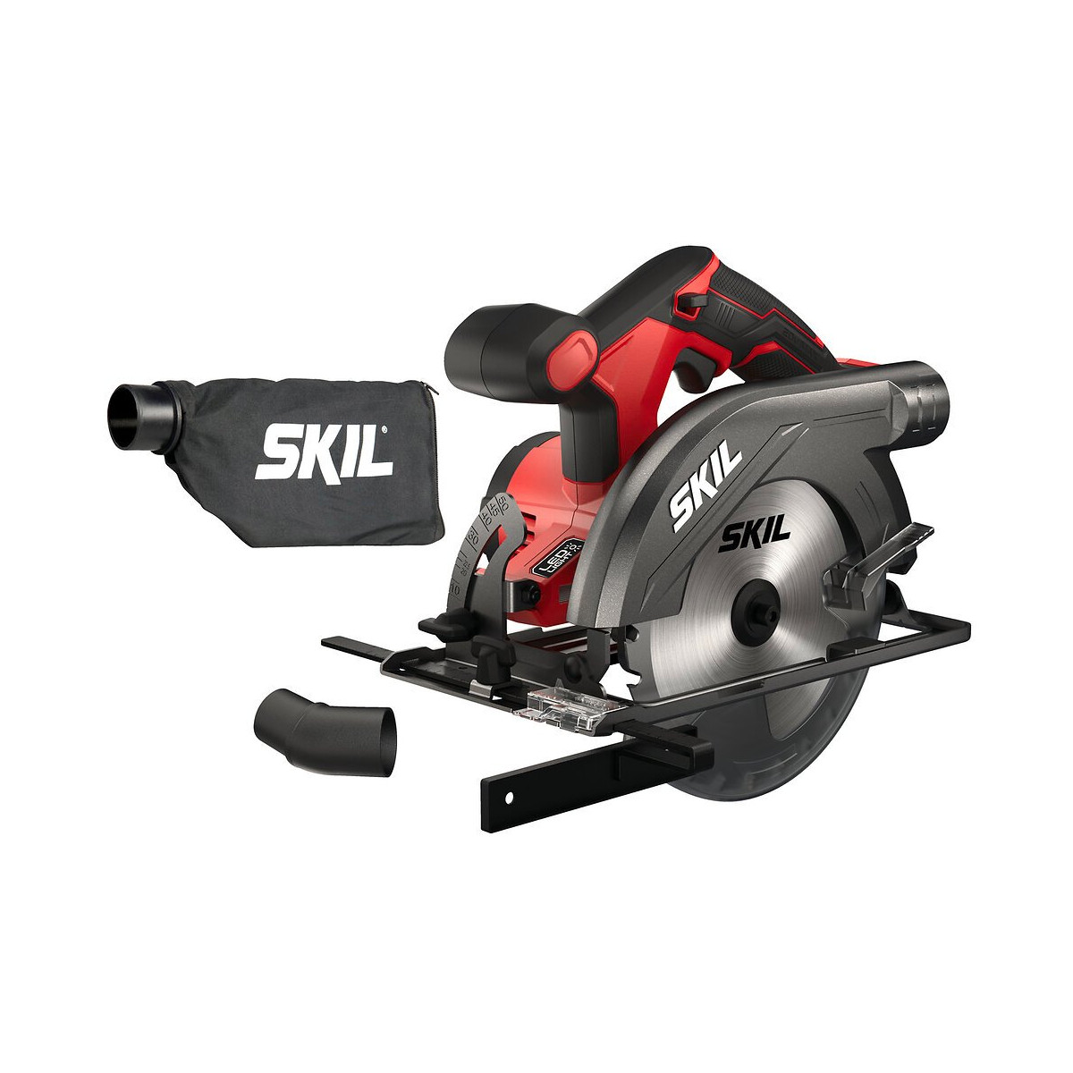 Scie circulaire sans fil de précision avec viseur de trait de coupe La scie circulaire sans fil « 20V Max » (18 V) SKIL 3520 est idéale pour effectuer des coupes de précision jusqu’à une profondeur de 54 mm. À titre d’exemple, cette capacité de sciage convient parfaitement pour les profondeurs les plus courantes (planches, poutres, etc.). Bonne visibilité du travail effectué grâce à l’éclairage LED. La semelle inclinable permet de réaliser des coupes biaises jusqu’à un angle de 50°. Un viseur de coupe permet un suivi précis et facile de la ligne tracée sur la pièce. Pour que l’environnement de travail reste propre, la scie dispose aussi d’un adaptateur pour aspirateur compatible avec la plupart des aspirateurs standard. La scie dispose aussi d’un frein électrique améliorant le confort d’utilisation et d’un blocage de l’arbre pour un changement de lame rapide. La scie circulaire est dotée de roulements à billes étanches pour garantir la durabilité de l’outil. Les roulements à billes étanches protègent la scie de la poussière et allongent ainsi la durée de vie de l’outil. Qui plus est, la scie circulaire est munie de poignées bi-matière ergonomiques assurant une prise en main et un confort parfaits. La scie SKIL 3520 CA est fournie avec une lame de 24 dents à mises en carbure, un guide parallèle, un adaptateur pour aspirateur et un sac à poussière. Livrée sans batterie ni chargeur Tension : 20 « V Max » Capacité de sciage à 90° : 54 mm Capacité de sciage à 45° : 44 mm Vitesse à vide : 4.500 tr/min. Ø lame : 165 mm Ø alésage de l’arbre : 16 mm Raccord pour aspirateurSpécifications techniques