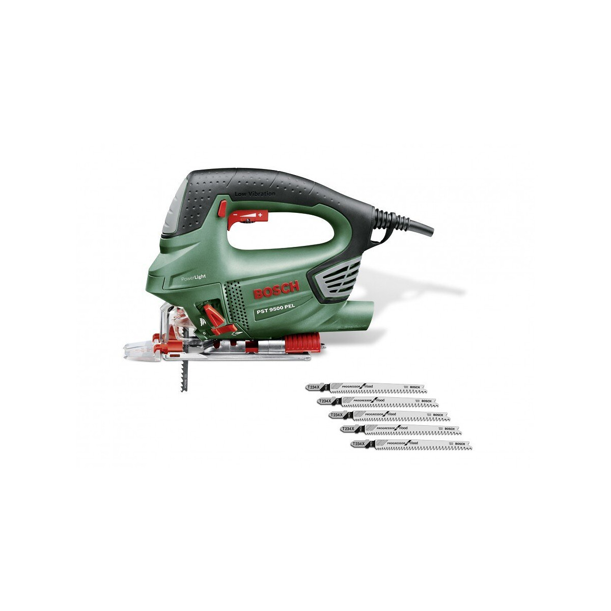 Scie sauteuse PST 9500 PEL qui offre une très grande précision pour vos découpes droites et courbes. Pare-éclat, pour plus de sécurité et fonction soufflerie. Plaque de base en acier orientable latéralement et horizontalement. Interrupteur avec démarrage progressif et présélection de la vitesse. Un design plus ergonomique. Mouvement pendulaire 4 positions. Caractéristiques techniques : Puissance absorbée : 620 W. Vitesse à vide : 0-500/0-3100 tr/min. Capacité de coupe bois/aluminium/acier : 95 / 15 / 8 m. Poids (câble inclus) : 2,2 kg. Livré avec : Coffret, lame T144 D, pare-éclat et CutControl + range lame.Spécifications techniques