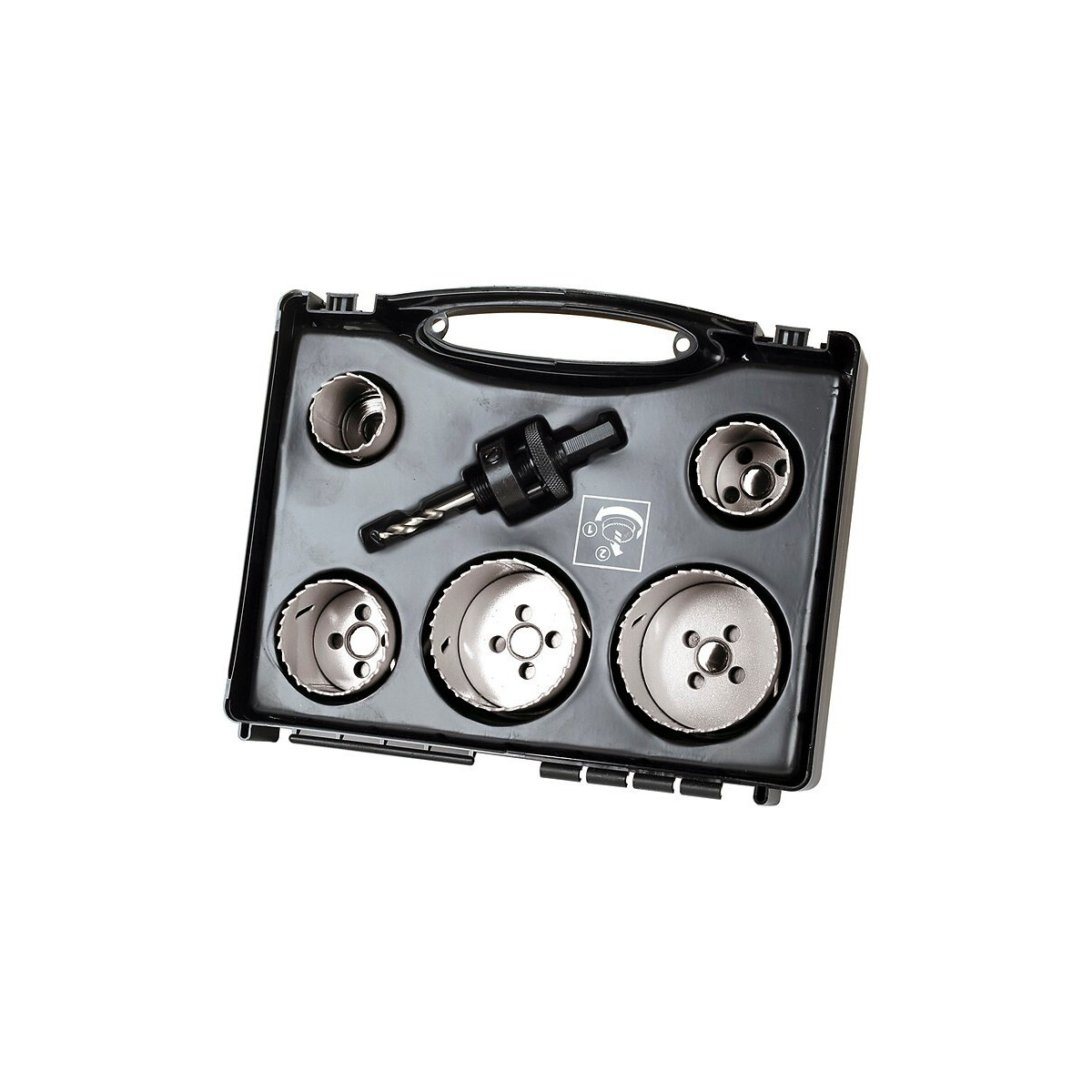 Coffret trépans 5 trépans BIM diamètre 35, 40, 51, 65, 68 mm. - 1 axe avec foret centreur. Pour perceuses. Pour bois et métaux maximum. mm RPM diamètre 35 mm 2400 - diamètre 40 mm 2100 - diamètre 51 mm - 2000 - diamètre 65 mm 1850 - diamètre 68 mm 1800. Pour métaux non-ferreux maximum. mm RPM diamètre 35 mm 250 - diamètre 40 mm 220 - diamètre 51 mm - 170 - diamètre 65 mm 130 - diamètre 68 mm 130. Profondeur de coupe 40 mm. Pour bois, contreplaqués, acier, métaux non-ferreux, plastiques et plaques de plâtre. Pour l'encastrement des boîtiers électriques et spots halogènes. Label TUV.