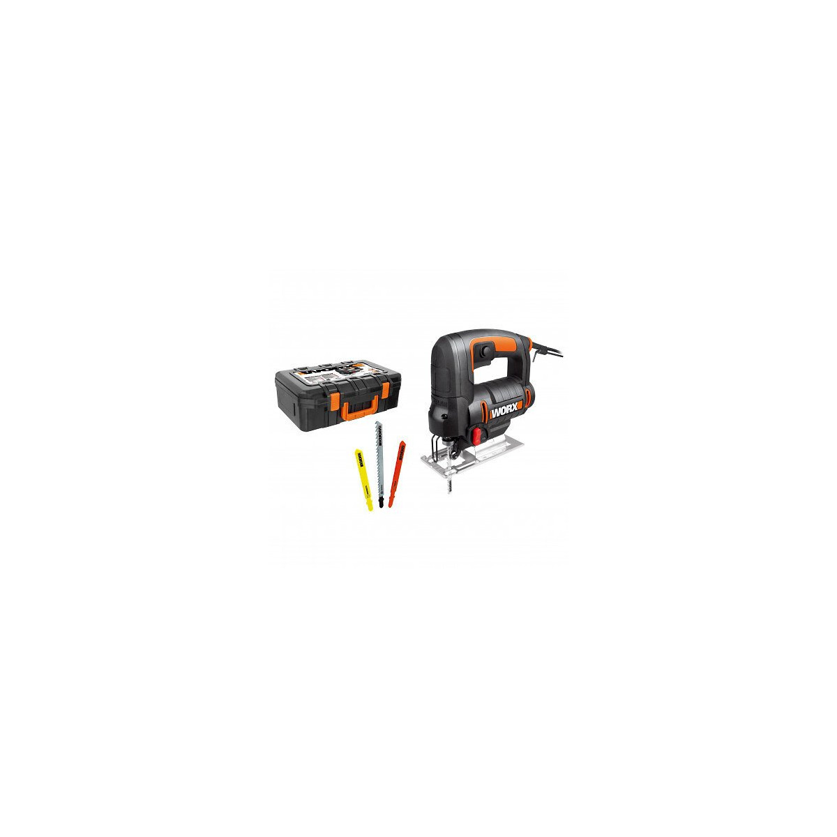 SCIE SAUTEUSE 550W WORX Caractéristiques: - Système de changement de couteau sans outils - Système pendulaire à 4 niveaux pour une meilleure efficacité de coupe - Système de soufflage de copeaux pour une meilleure visibilité - Base réglable pour les coupes en biseau: 0-45º - Système d'extraction de poussière Données techniques: - Puissance: 550W - Course à vide: 3100 min - Max. Capacité de coupe: bois 65 mm / aluminium 12 mm / acier 6 mm - Longueur de course: 20mm - Coupe en biseau: 0 + - 45º - Poids: 2,20 kg Comprend: - 1 jeu de trois lames de coupe - 1 clé hexagonale - 1 valise de transport