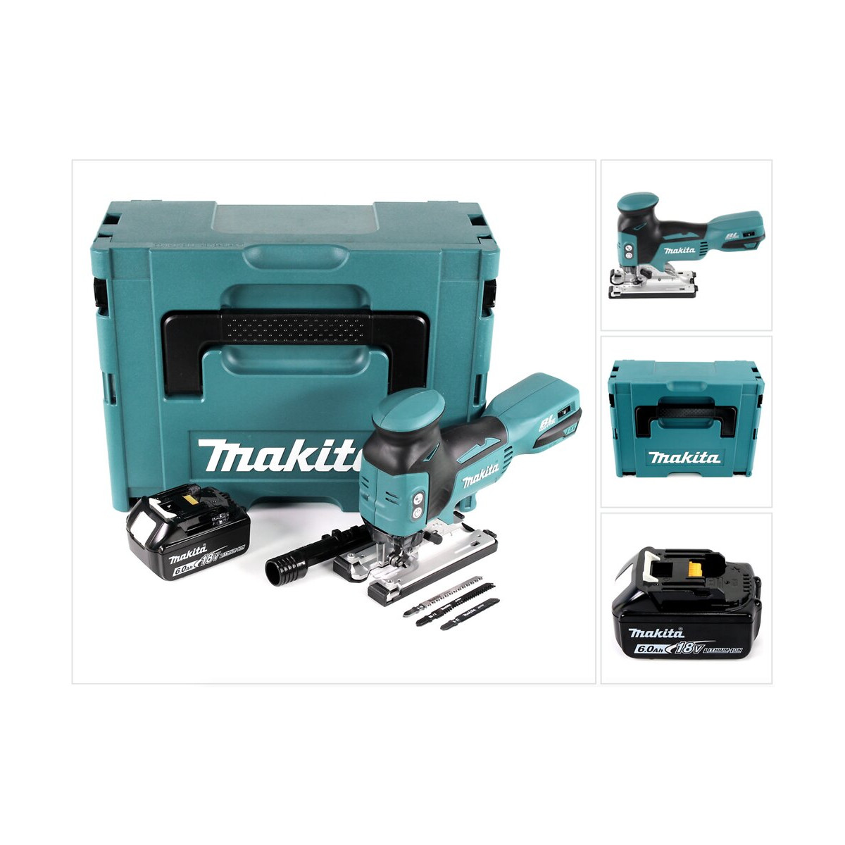 Contenu du paquet: - 1x Makita DJV 181 Scie sauteuse sans fil - 1x Buse d'aspiration - 1x plaque coulissante - 2x Lames de scie Makita pour bois B-10 - 2x Lames de scie Makita pour bois B-13 - 2x Lames de scie Makita pour métal B-22 - 1x Batterie Makita BL 1860 B 18 V 6000 mAh / 6,0 Ah - 1x Coffret de transport Makita Makpac 2 - 1x Insert universel - sans Chargeur Description du produit: La scie sauteuse sans fil Djv 181 de Makita impressionne par sa construction légère, maniable et ses performances accrues grâce au moteur sans balai(Brushless). Cette scie sauteuse dispose de 3 réglages de course du pendule et d'une position neutre, de plus, la fréquence de course est contrôlée électroniquement et le moteur est équipé d'un démarrage en douceur. La plaque de base peut être pivotée à 45 ° des deux côtés. Le changement de lame de scie sans outil et la double Led, qui éclairent parfaitement la zone de travail, sont particulièrement pratiques. Spécifications techniques: Cadense de coupe maximale: 800 - 3.500 cps/min Longueur de course: 26 mm Capacité de coupe dans le bois: 135 mm Capacité de coupe dans l'acier: 10 mm Tension de la batterie: 18 V Poids: 2,5 kg