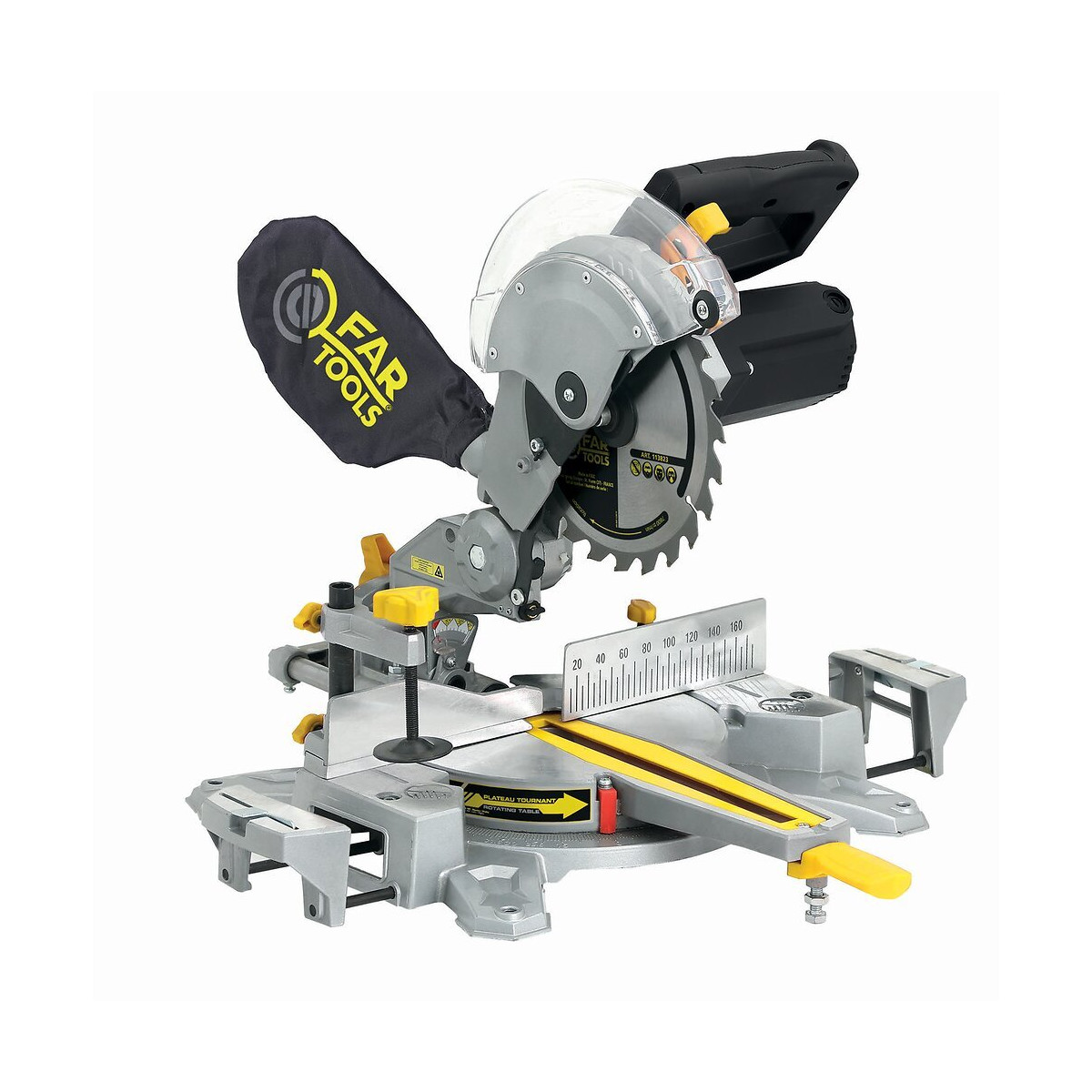 Scie à onglet radiale de 1650W, Diam 210mmx25,4m - Avec 36 dents et une LED d'éclairage - Visée laser(2x1,5V) - Capacité de coupe de 90°=210x60mm&45°=210x34mm -Vitesse de rotation = 5000tr/min - Blocage d'arbre - 2 extensions latérale - 1 presse de serrage - Livré avec un sac de récupération des poussières - Pour découper et scier de longues pièces de bois (type tasseau) avec différents angles - Plateau et lame inclinables permettant toutes les coupes possibles.
