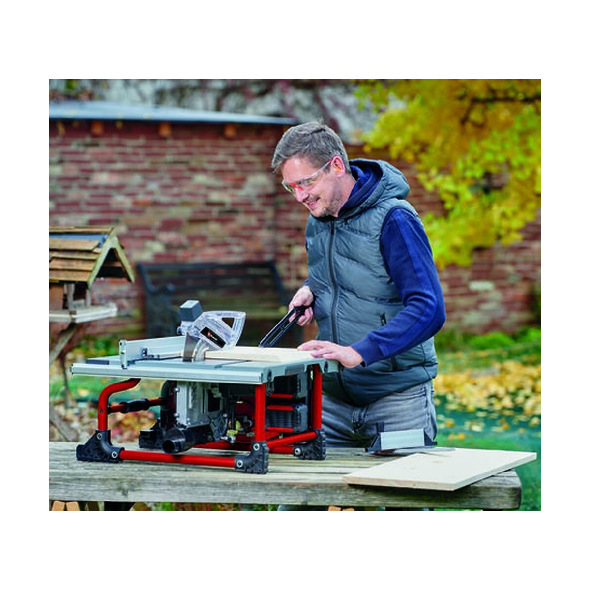 La scie circulaire sur table sans fil Einhell est un outil de base idéal pour tous les bricoleurs qui travaillent le bois. Elle permet de découper et raccourcir aussi bien les bois tendres que les bois durs. La table en aluminium stable, légère et rigide a des propriétés de glissement parfaites. La table dispose d’une extension à droite pour les pièces plus larges. Petite et compacte, cette scie circulaire sur table s’installe dans les ateliers ou garages de petites dimensions, et est également idéale pour les utilisations mobiles. Les + du produit Table en aluminium stable et légère avec des propriétés de glissement parfaites Extension de table à droite pour les pièces plus larges Outil petit et compact, idéal pour les espaces réduits ou les utilisations mobiles La fonction de démarrage progressif protège le moteur et l’engrenage. Butée parallèle extrêmement stable pour des coupes longitudinales précises Butée d’angle pour des coupes en biais précises de - 60° à + 60° incluse Lame aux carbures de tungstène haute qualité, conçue spécialement pour les scies sans fil Lame de scie réglable en hauteur en continu pour une plus grande sécurité Lame de scie inclinable en continu de 45° à gauche pour les coupes d’onglets Raccords d’aspiration au niveau du carter et protège-lame pour limiter les salissures Supports pour le rangement de tous les accessoires sur l’appareil Recommandation pour une performance optimale : batterie 2,5 Ah Plus ou supérieure Caractéristiques techniques Vitesse à vide : 3800 min^-1 Lame de scie : 210 mm x 30 mm Amplitude de pivotement de la lame de scie : 45 ° Hauteur de coupe maximum 90 ° : 70 mm Hauteur de coupe maximum 45 ° : 45 mm Taille de la table de travail : 480 mm x 467 mm Taille de l'extension droite de la table : 480 mm x 70 mm Extension de table télescopique : 370 mm Poids du produit (kg) : 13.145