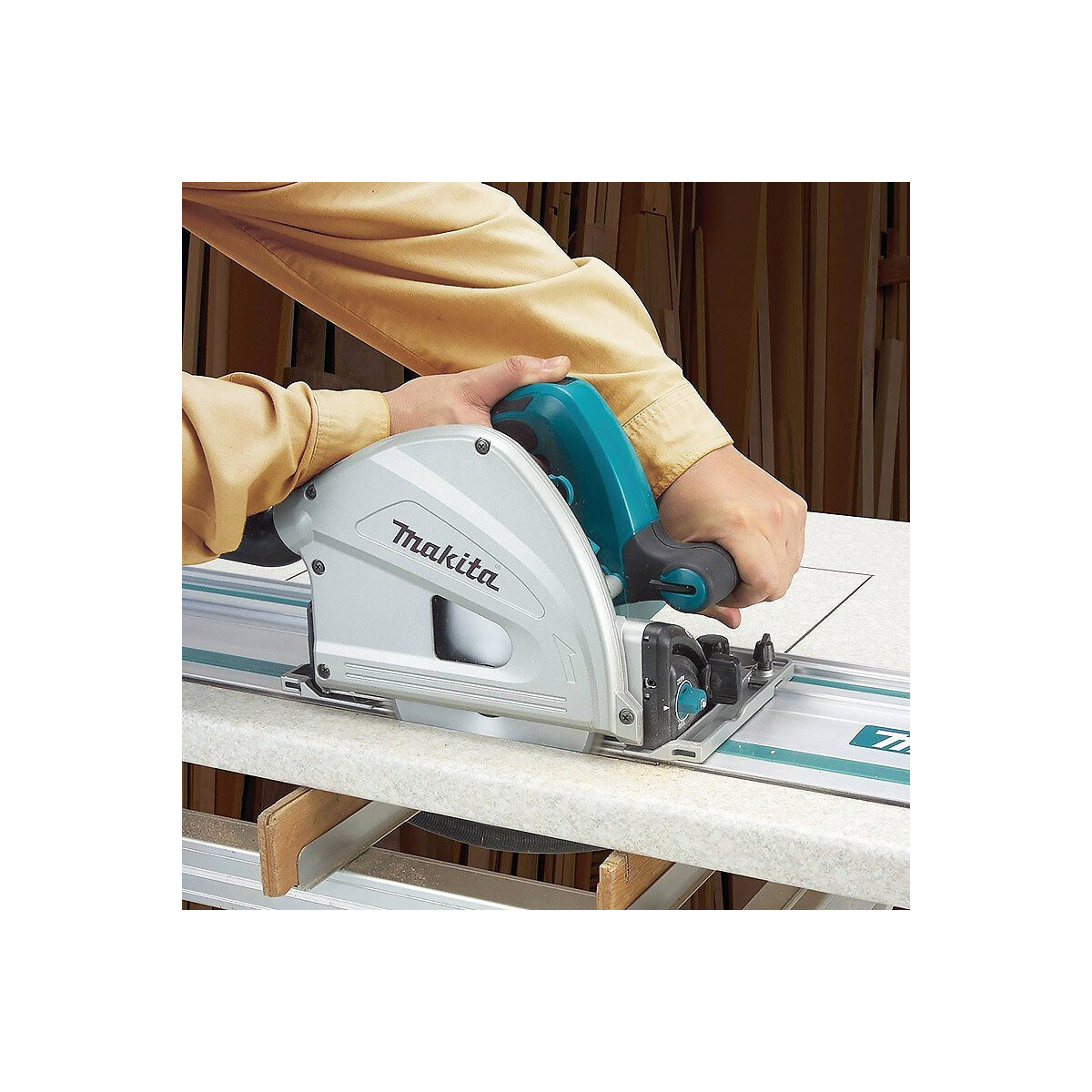 Avantages produit Scie Circulaire Plongeante MAKITA SP6000J + Rail Livré de série en coffret MAK-PAC, compatible avec les systèmes empilables standards Machine puissante et précise, dotée de systèmes électronique et mécanique de sécurité Régulateur électronique pour un démarrage sans à-coups et un maintien du régime sélectionné Sécurité anti-basculement pour coupes biaises Réglages faciles sans outil Repères gradués pour un réglage précis Compatible avec les rails de guidage d'autres fabricants Caractéristiques techniques Scie Circulaire Plongeante MAKITA SP6000J + Rail Puissance Puissance nominale 1300 W Régime Vitesse à vide max. 2000 à 5800 tr/min Capacité de coupe Hauteur de coupe max. à 48° 38 mm Hauteur de coupe max. à 90° 56 mm Inclinaison (Biaise) D/G 48/1 ° Hauteur de coupe max. à 45° 40 mm Outillage à utiliser Diamètre de la lame 165 mm Diamètre de l'alésage 20 mm Niveaux d'exposition Taux de vibration triaxial (ah) 2,5 m/s² Marge d'incertitude (K) 1,5 m/s² Marge d'incertitude bruit (K) 3 dB (A) Pression sonore (Lpa) 91 dB (A) Puissance sonore (Lwa) 102 dB (A) Général Dimensions (L x l x h) 341 x 225 x 250 mm Longueur cordon d'alimentation 2,5 m Poids net 4,4 kg Accessoires 1 X 783203-8 Clé à six pans 5 1 X 821552-6 Coffret 4 MAK-PAC 1 X B-07353 Lame carbure Bois 165 x 48D 1 X 837804-5 Moulage MAK-PAC Scie Plongeante 1 X 194368-5 Rail de guidage Makita 1400 mm pour scies circulaires et scies sauteuses