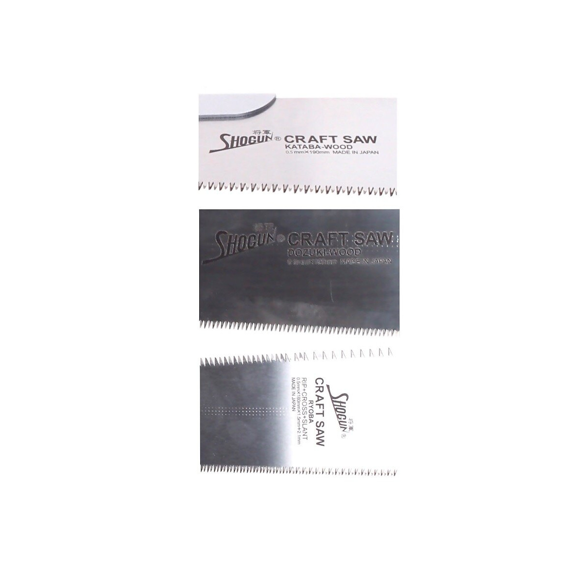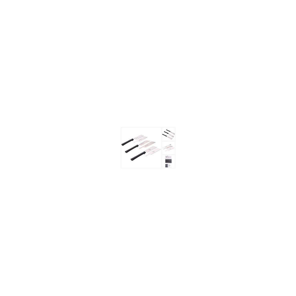 Contenu du paquet: -1 x Shogun RYOBA Japan Lame de scie à bois universelle, longue manche ( M-180R ) -1x Shogun DOZUKI Japan Lame de scie à bois universelle, longue manche( M-190D ) -1 x Shogun KATABA Lame de scie à bois universelle, longue manche ( M-190W ) -1x Shogun RYOBA Japon Lame de scie à bois universelle, 180 mm, trempée par impulsion (M-180R/SB) -1x Shogun DOZUKI Japon Lame de scie à bois universelle, 190 mm, trempée par impulsion (M-190D/SB) -1x Shogun KATABA Japon Lame de scie à bois universelle, 190 mm, trempée par impulsion (M-190W/SB) Description du produit: Le set de lames de scie japonaises Shogun est composé des lames de scie à bois universelles RYOBA, DOZUKI et KATABA avec une longueur de lame de 180 mm à 190 mm, qui sont toutes équipées d'une longue manche. Ce jeu comprend, en plus, trois lames de rechange assorties, exactement une pour chacune de ces lames, en plus des scies japonaises existantes. Avec la denture spéciale à double profondeur et l'espacement des dents de 1,25 mm à 1,76 mm, un sciage rapide et précis, par exemple sur les branches d'un arbre, ainsi qu'un retrait rapide et propre de la pièce sont possibles sans aucun problème. En outre, le sciage du contreplaqué et du bois vert n'est pas un problème. Ce set avec des lames de scie pour diverses applications, à l'instar de la RYOBA, qui impressionne par ses deux dents de scie différentes, permet de couvrir tous les travaux de sciage. Ces lames sont fixées à l'aide de sa vis de blocage et, durcie par impulsion, elles sont particulièrement robustes et durent jusqu'à trois fois plus longtemps que l'acier conventionnel. Ces lames interchangeables confirment le concept bien pensé du Shogun, vous n'avez donc qu'à les remplacer lorsqu'elles sont usées au lieu d'acheter une nouvelle scie. Une longue tradition de scies est associée au pays de fabrication du Japon, la qualité le confirme. Spécifications techniques: RYOBA (M-180R) : Longueur de la lame : 180 mm Épaisseur de la lame : 0,5 mm Acier : acier spécial (trempé par impulsion) Joint de coupe : 0,9 mm Denture : 1,5 mm / 2,14 mm Champs d'application : bois, bois vert, contreplaqué DOZUKI (M-190D) : Longueur de la lame : 190 mm Épaisseur de la lame : 0,3 mm Acier : acier spécial (trempé par impulsion) Joint de coupe : 0,5 mm dentelure : 1,3 mm Champs d'application : bois, contreplaqué KATABA ( M-190W ) : Longueur de la lame : 190 mm Épaisseur de la lame : 0,5 mm Acier : acier spécial (trempé par impulsion) Joint de coupe : 0,7 mm Denture : 1,76 mm Champs d'application : bois, contreplaqué