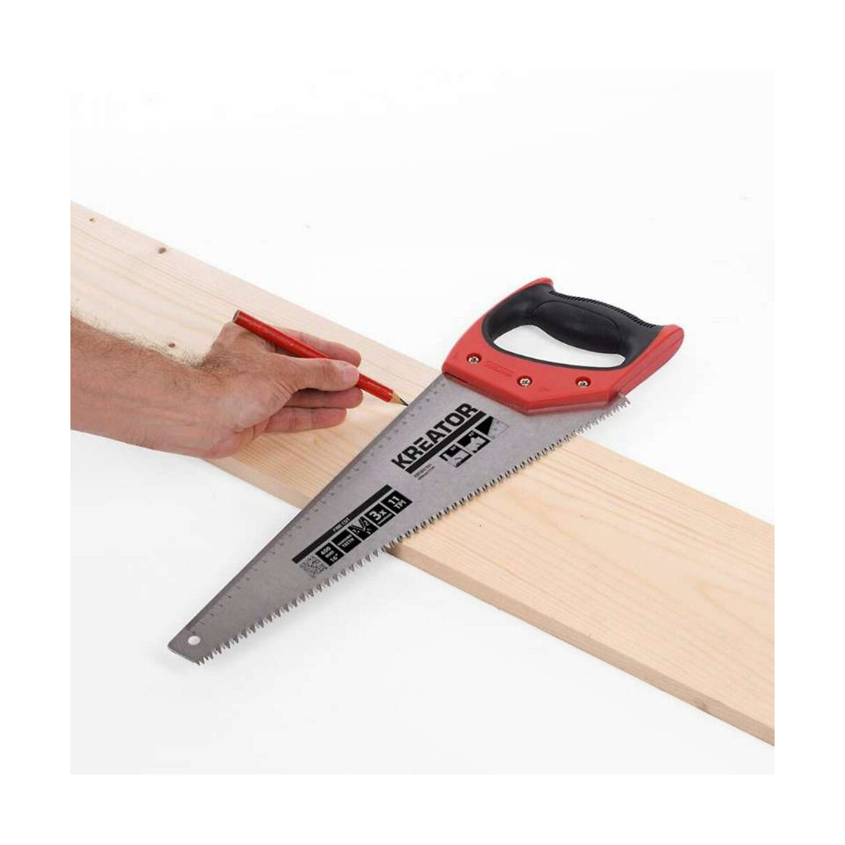 Description détaillée du produit: Produit: scie manuelle Longueur: au choix Scie à 7 TPI dents par pouce Matériau lame: acier 65 Mn Lame en acier avec dents renforcées aiguisées sous 3 angles Fournit une découpe parfaitement nette Angles de repérage à 45 et 90 degrés Graduation en mm Prise ergonomique au toucher soft en ABS et caoutchouc TPR Idéale pour tous vos travaux de menuiserie, charpentes, bricolage sur bois... Marque: Kreator