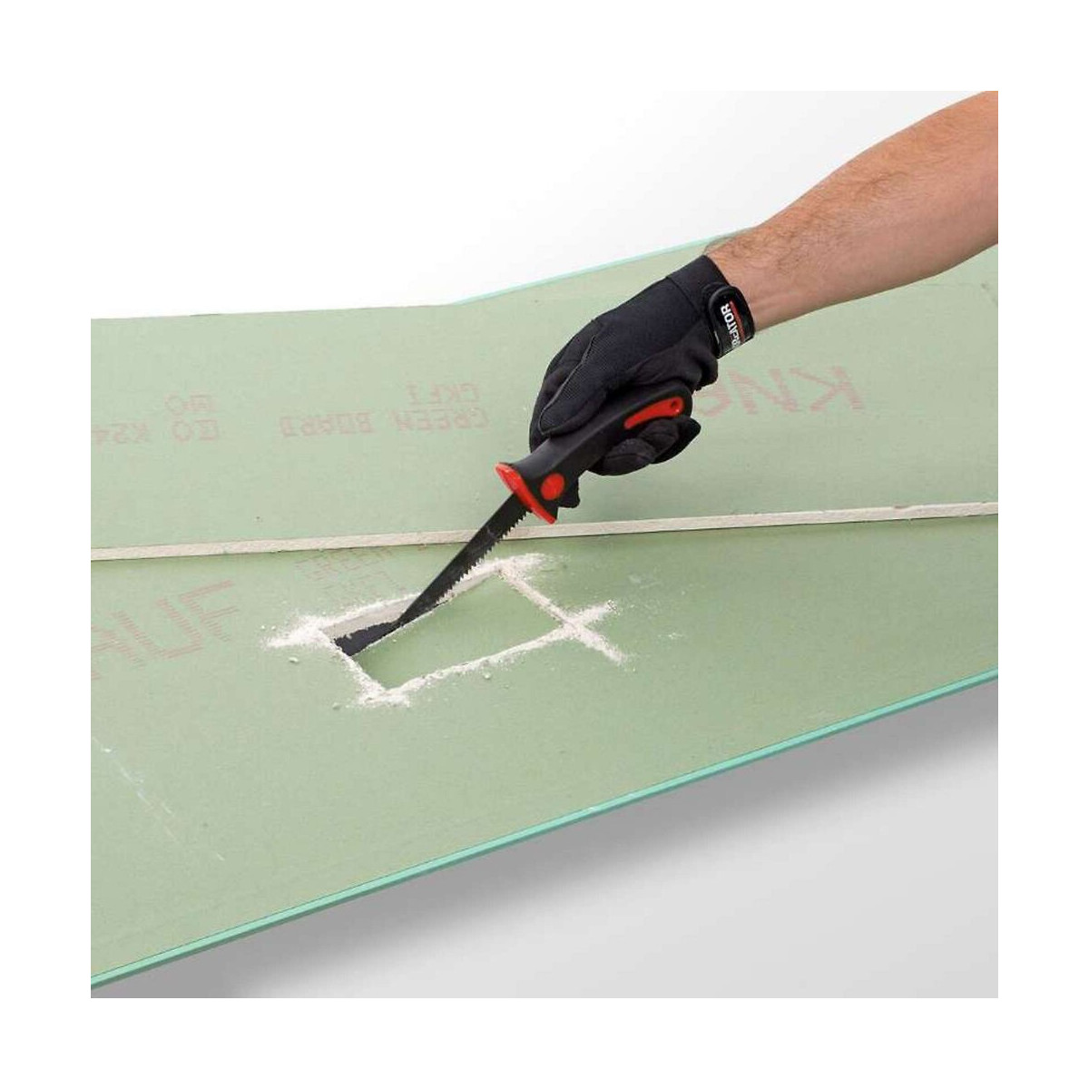 Caractéristiques techniques: Produit: scie à guichet Type: scie égoïne Longueur de la lame: 180 mm Épaisseur lame: 1,2 mm 7 dents par pouce Utilisation: découpe de gypse, fibre ou plâtre Poignée antidérapante en ABS et caoutchouc TPR Matière: acier 65 Mn Coloris: rouge et noir Marque: Kreator