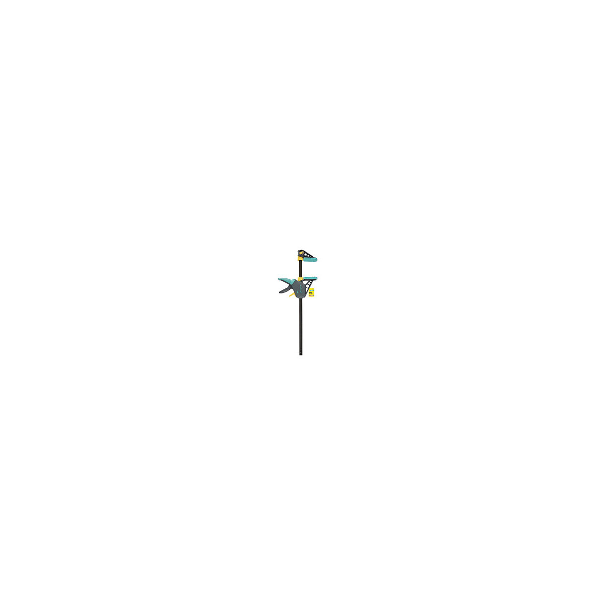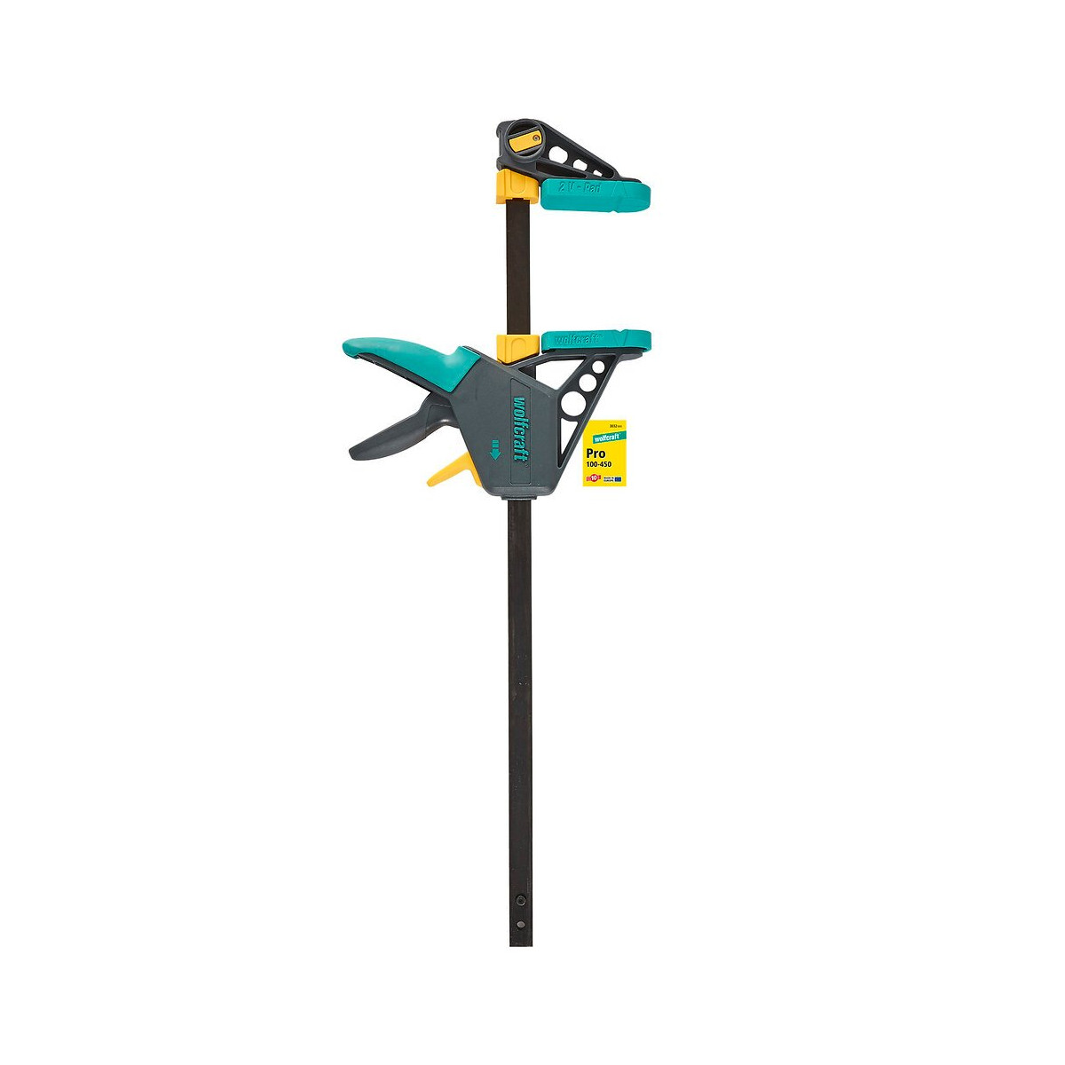 Serre-joint 1 main. Saillie 100 mm. Ouverture jusqu'à 450 mm. Capacité d'écartement 210 - 710 mm. Serrage rapide, sûr et confortable - d'une seule main. Robustesse et puissance - force de serrage jusqu'à 120 kg. Conversion sans effort en écarteur sur simple pression d'un bouton. Desserrage très facile grâce à un effet levier optimal. Rainure croisée pour serrer de manière sûre les tubes et pièces rondes. Des cales coulissantes ménagent la pièce et servent de support. Répartition uniforme de la force de serrage pour ménager la pièce grâce à de grandes surfaces de serrage et une saillie extrême (100 mm). Maniement très simple et préhension sûre grâce à une poignée ergonomique à zone antidérapante. Tige de haute qualité qui assure une force de serrage élevée et de longue durée. Axe de haute résistance en acier C45 trempé bruni anti-corrosion. Fabrication européenne. Garantie 10 ans.
