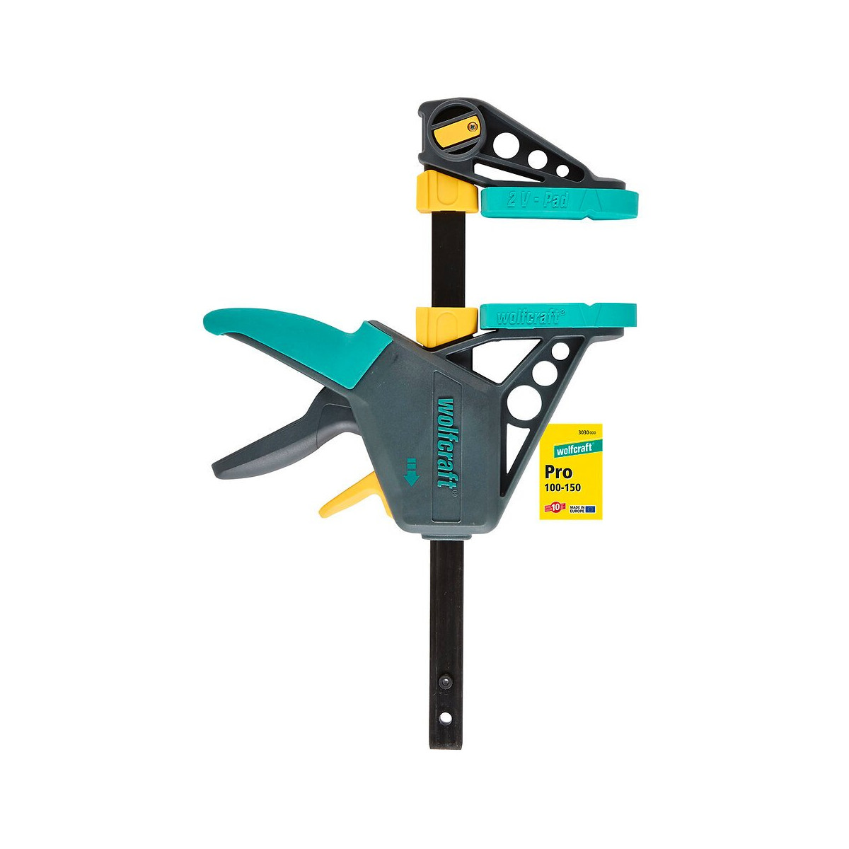 Serre-joint 1 main. Saillie 100 mm. Ouverture jusqu'à 150 mm. Capacité d'écartement 210 - 410 mm. Serrage rapide, sûr et confortable - d'une seule main. Robustesse et puissance - force de serrage jusqu'à 120 kg. Conversion sans effort en écarteur sur simple pression d'un bouton. Desserrage très facile grâce à un effet levier optimal. Rainure croisée pour serrer de manière sûre les tubes et pièces rondes. Des cales coulissantes ménagent la pièce et servent de support. Répartition uniforme de la force de serrage pour ménager la pièce grâce à de grandes surfaces de serrage et une saillie extrême (100 mm). Maniement très simple et préhension sûre grâce à une poignée ergonomique à zone antidérapante. Tige de haute qualité qui assure une force de serrage élevée et de longue durée. Axe de haute résistance en acier C45 trempé bruni anti-corrosion. Fabrication européenne. Garantie 10 ans.
