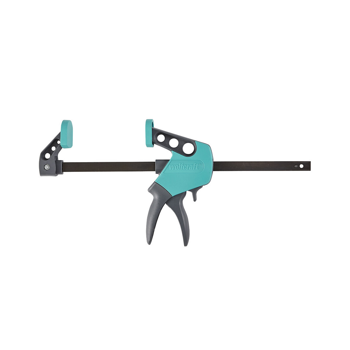 Serre-joint 1 main Easy. Puissance de serrage 90 kg. Saillie 75 mm. Ouverture jusqu'à 300 mm. Capacité d'écartement 180 - 540 mm. Conversion sans effort en écarteur Maniement très simple, avec deux fonctions de base : serrage et desserrage. Poignée ergonomique pour une prise en main confortable. Tige en acier trempé. Mors en plastique renforcé à la fibre de verre. Fabrication européenne. Garantie 10 ans.