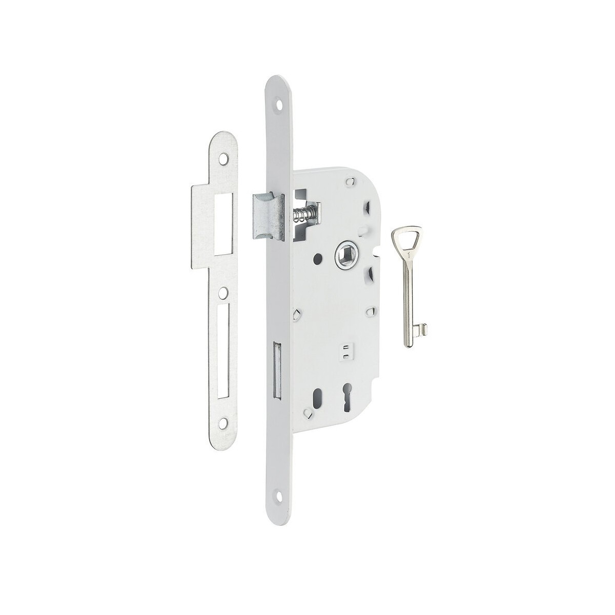 Serrure à encastrée. Pêne dormant 1/2 tour. Axe à 40 mm. Coffre acier embouti. Têtière Bouts ronds acier. Demi-tour alliage réversible sans démontage du coffre. Pêne acier. Gâche plate acier. Mécanisme à 1 tour. 7 mm, entraxe 70 mm. 1 clé. 6 variures. Finition : Epoxy Blanc. Utilisation : Porte isoplane < 40 kg, (non garantie en cas de contre Béquillage) Utilisation : Porte intérieure.Spécifications techniques