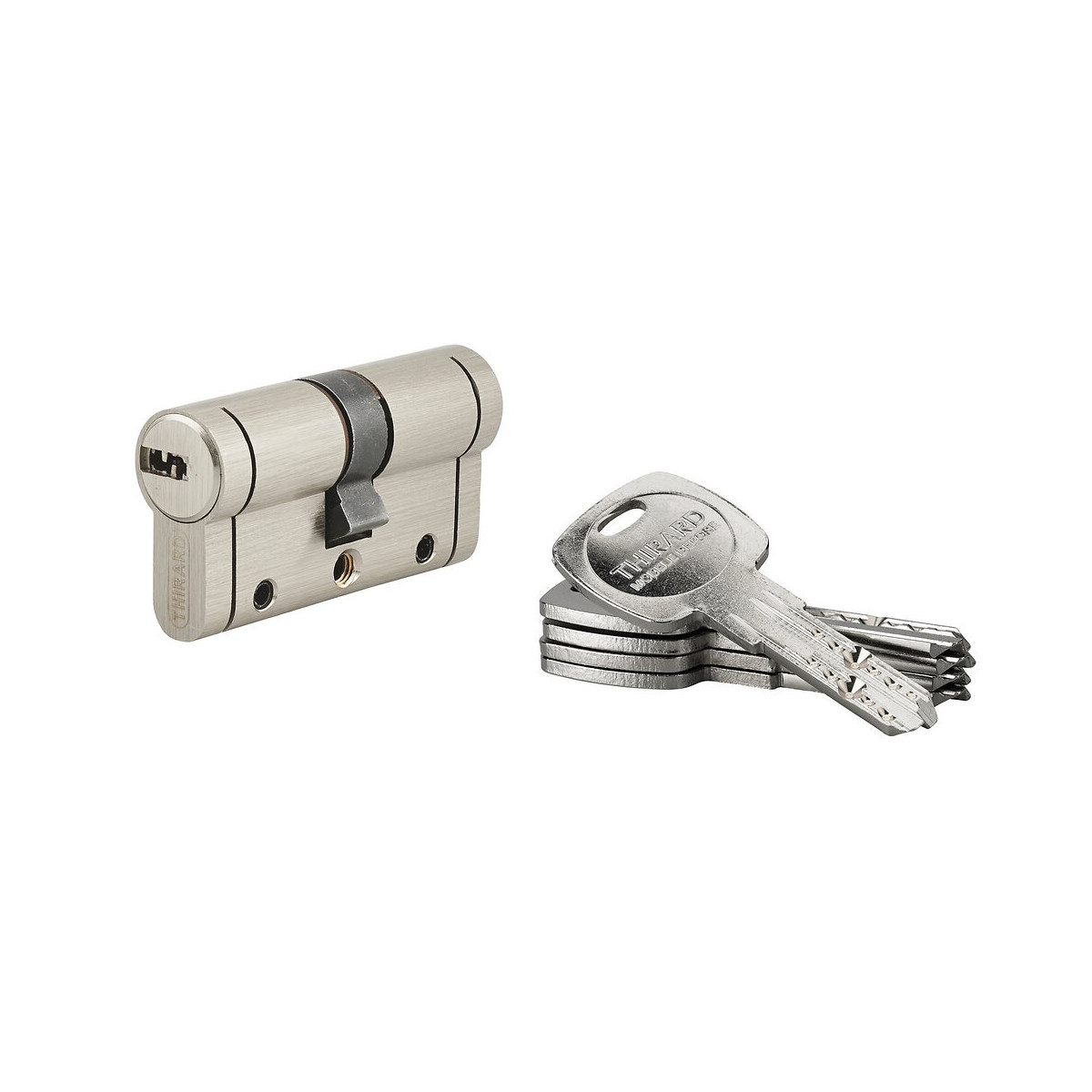 Cylindre 30x30 mm. Profil européen laiton. Mécanisme à goupilles contre le crochetage. Protection contre le perçage par aiguille et 1ère goupille en acier trempé. Protection contre la casse par poutre. Protection contre l'effraction de la partie saillante du cylindre (anti-snap). Panneton anti-arrachement. 5 clés plates réversibles laiton nickelé avec carte de propriété. Finition : nickel satin. Garantie : 10 ans.Spécifications techniques
