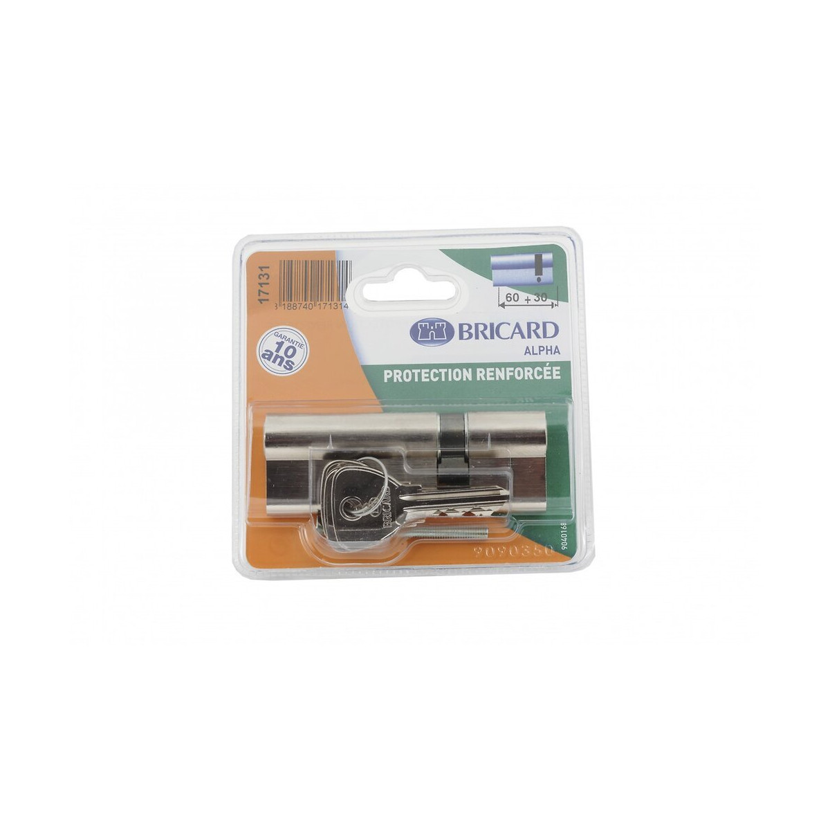 Taille du cylindre (extérieur et intérieur) (en mm): 30 + 60 Destination: Pour porte de cabanon, portail, cave, remise et bureau Niveau de sécurité (en indice): Faible niveau de sécurité Nombre de goupilles: 5 Longueur du cylindre (en mm): 30+60 Type de cylindre: 2 entrées de clé Matière du cylindre: Laiton nickelé Résistance accrue à la corrosion: Non Conseil d'entretien: Pour la pose: une fois le cylindre installé, vérifier le bon fonctionnemment du mécanisme avant de fermer la porte. Pour l'entretien: utiliser régulièrement du graphite pour éviter le grippage de votre cylindre. Ne jamais utiliser d'huile ou de corps gras Nombre de clés: 3 Mode de reproduction de la clé: Double de clés réalisé chez le fabricant grâce au numéro de la clé d'origine, sur commande en magasin Antiperçage: Non Anticrochetage: Oui Anticasse: Non Produit emballé : hauteur (en cm): 11.7 Produit emballé : largeur (en cm): 11.8 Produit emballé : profondeur (en cm): 3.1 Produit emballé : poids (en kg): 0.318