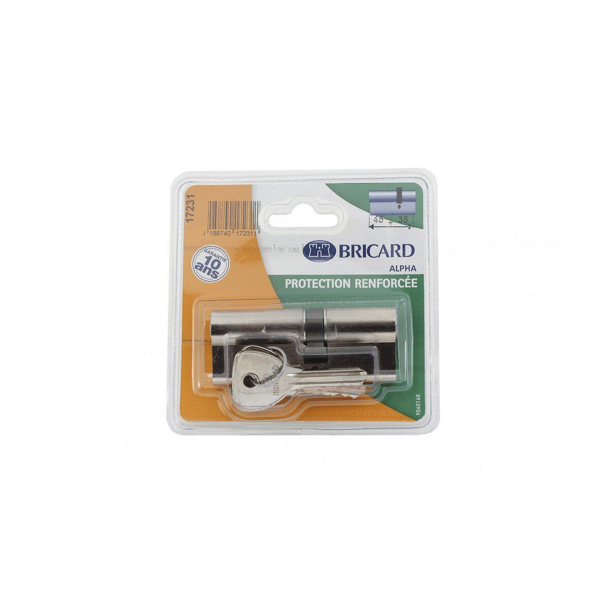 Taille du cylindre (extérieur et intérieur) (en mm): 35 + 45 Destination: Pour porte de cabanon, portail, cave, remise et bureau Niveau de sécurité (en indice): Faible niveau de sécurité Nombre de goupilles: 5 Longueur du cylindre (en mm): 35+45 Type de cylindre: 2 entrées de clé Matière du cylindre: Laiton nickelé Résistance accrue à la corrosion: Non Conseil d'entretien: Pour la pose: une fois le cylindre installé, vérifier le bon fonctionnemment du mécanisme avant de fermer la porte. Pour l'entretien: utiliser régulièrement du graphite pour éviter le grippage de votre cylindre. Ne jamais utiliser d'huile ou de corps gras Nombre de clés: 3 Mode de reproduction de la clé: Double de clés réalisé chez le fabricant grâce au numéro de la clé d'origine, sur commande en magasin Antiperçage: Non Anticrochetage: Oui Anticasse: Non Produit emballé : hauteur (en cm): 11.5 Produit emballé : largeur (en cm): 11.6 Produit emballé : profondeur (en cm): 3.2 Produit emballé : poids (en kg): 0.288