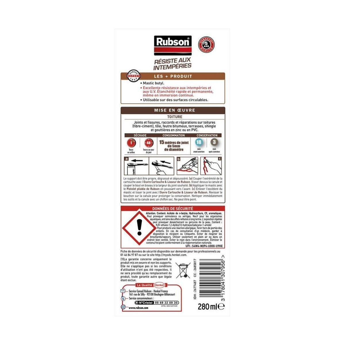 Sa formule permet une étanchéité rapide et permanente même sur support humide. Destination du produit: Toiture Usage du produit: Toiture Support: Tous supports : béton, ciment, tuile, ardoise... Composition: Polymère Type de produit: D'étanchéité Aspect: Mat Garantie de résistance (en année): 5 ans sur l'étanchéité, l'adhérence et la blancheur du joint Temps de séchage (en h): 24 Type de packaging: Cartouche Couleur: Noir Marque du produit: RUBSON Pistolet nécessaire: Oui Peut se peindre: Oui Conseil d'utilisation: Faire un essai préalable sur les matériaux sensibles : marbre, miroir … Produit emballé : hauteur (en cm): 23.1 Produit emballé : largeur (en cm): 6.6 Produit emballé : profondeur (en cm): 4.8 Produit emballé : poids (en kg): 0.388 Indication du geste de tri (triman): Nos produits et emballages peuvent faire l'objet d'une consigne de tri. Pour en savoir plus : www.quefairedemesdechets.fr Mentions légales: Dangereux. Respecter les précautions d'emploi