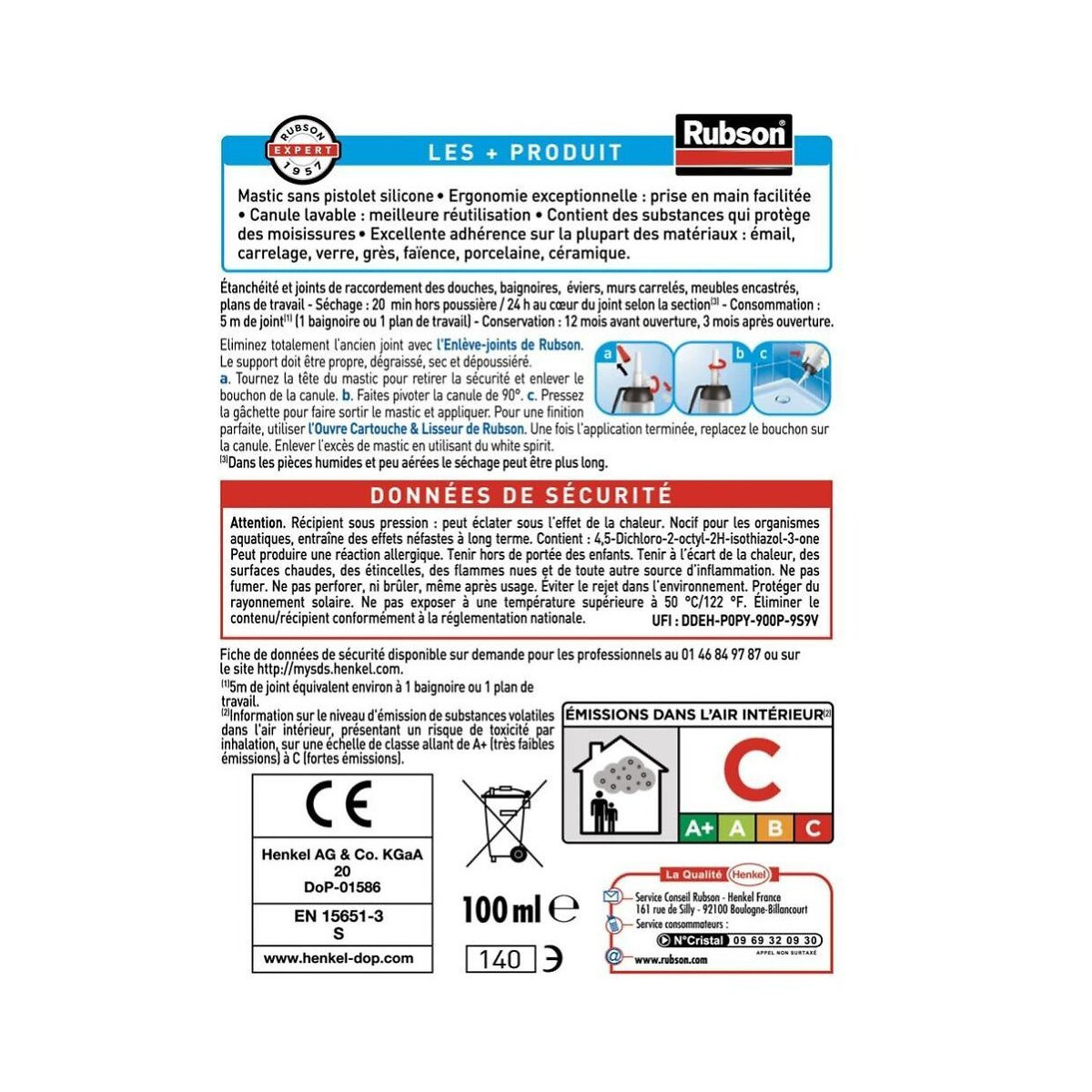Prêt l'emploi (Usage sans pistolet) Extrusion facile à base d'air comprimé Agents anti-moisissures : ne noircit pas. Reste souple et étanche. Prêt l'emploi (Usage sans pistolet) Extrusion facile à base d'air comprimé Agents anti-moisissures : ne noircit pas. Reste souple et étanche. Usage du produit: Cuisine et bain Support: Emails, matériaux synthétiques, douches, baignoires,éviers, lavabos… Composition: Silicone Type de produit: D'étanchéité Aspect: Brillant Temps de séchage (en h): 24 Type de packaging: Aérosol Couleur: Gris Marque du produit: RUBSON Pistolet nécessaire: Non Peut se peindre: Non Conseil d'utilisation: Faire un essai préalable sur les matériaux sensibles : marbre, miroir … Qualité de l'air intérieur: A Produit emballé : hauteur (en cm): 20.7 Produit emballé : largeur (en cm): 5.9 Produit emballé : profondeur (en cm): 4.4 Produit emballé : poids (en kg): 0.176 Indication du geste de tri (triman): Nos produits et emballages peuvent faire l'objet d'une consigne de tri. Pour en savoir plus : www.quefairedemesdechets.fr Mentions légales: Dangereux. Respecter les précautions d'emploi