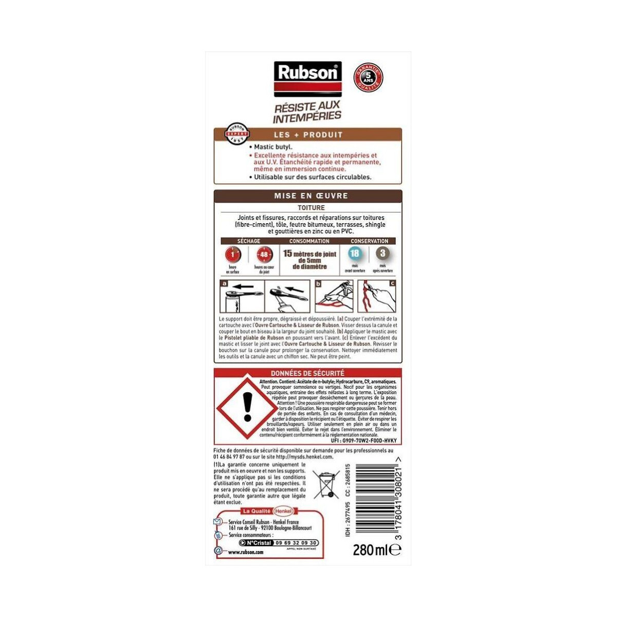 Sa formule résiste particulièrement aux piétinements et permet une étanchéité rapide et permanente même sur support humide. Destination du produit: Toiture Usage du produit: Toiture Support: Tous supports : béton, ciment, tuile, ardoise... Composition: Polymère Type de produit: D'étanchéité Aspect: Mat Garantie de résistance (en année): 5 ans sur l'étanchéité, l'adhérence et la blancheur du joint Temps de séchage (en h): 24 Type de packaging: Cartouche Couleur: Gris Marque du produit: RUBSON Pistolet nécessaire: Oui Peut se peindre: Oui Conseil d'utilisation: Faire un essai préalable sur les matériaux sensibles : marbre, miroir … Produit emballé : hauteur (en cm): 23.1 Produit emballé : largeur (en cm): 4.8 Produit emballé : profondeur (en cm): 6.4 Produit emballé : poids (en kg): 0.384 Indication du geste de tri (triman): Nos produits et emballages peuvent faire l'objet d'une consigne de tri. Pour en savoir plus : www.quefairedemesdechets.fr Mentions légales: Dangereux. Respecter les précautions d'emploi